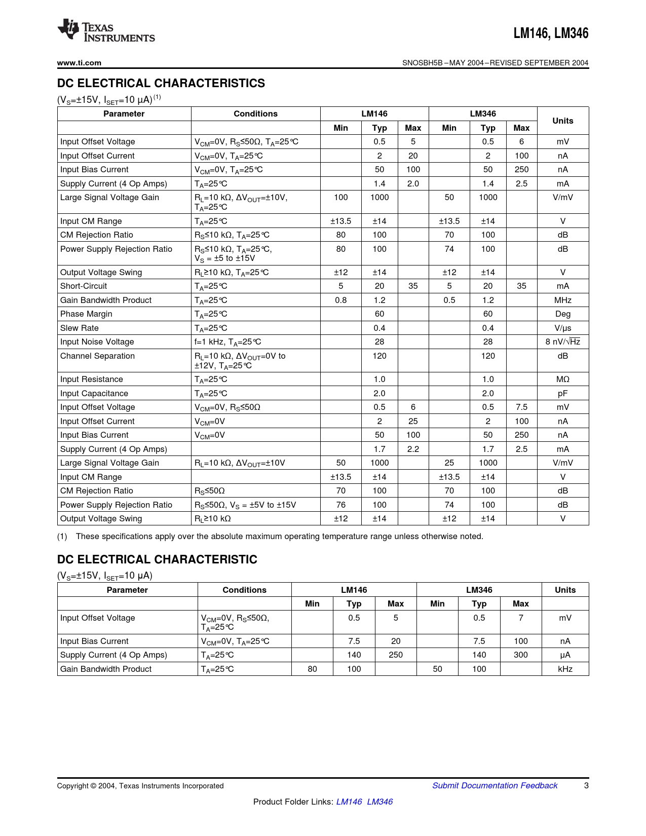 LM146,. LM346. www.ti.com. DC ELECTRICAL CHARACTERISTICS. Parameter. Conditions. LM146. Units. Min. Typ. Max. DC ELECTRICAL CHARACTERISTIC