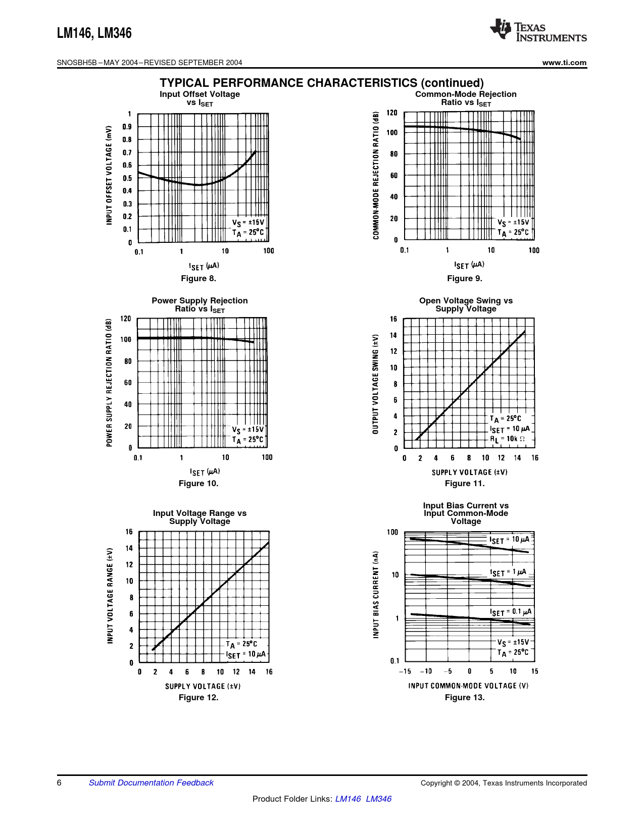 LM146,. LM346. www.ti.com. TYPICAL PERFORMANCE CHARACTERISTICS (continued) Input Offset Voltage. Common-Mode Rejection. vs ISET