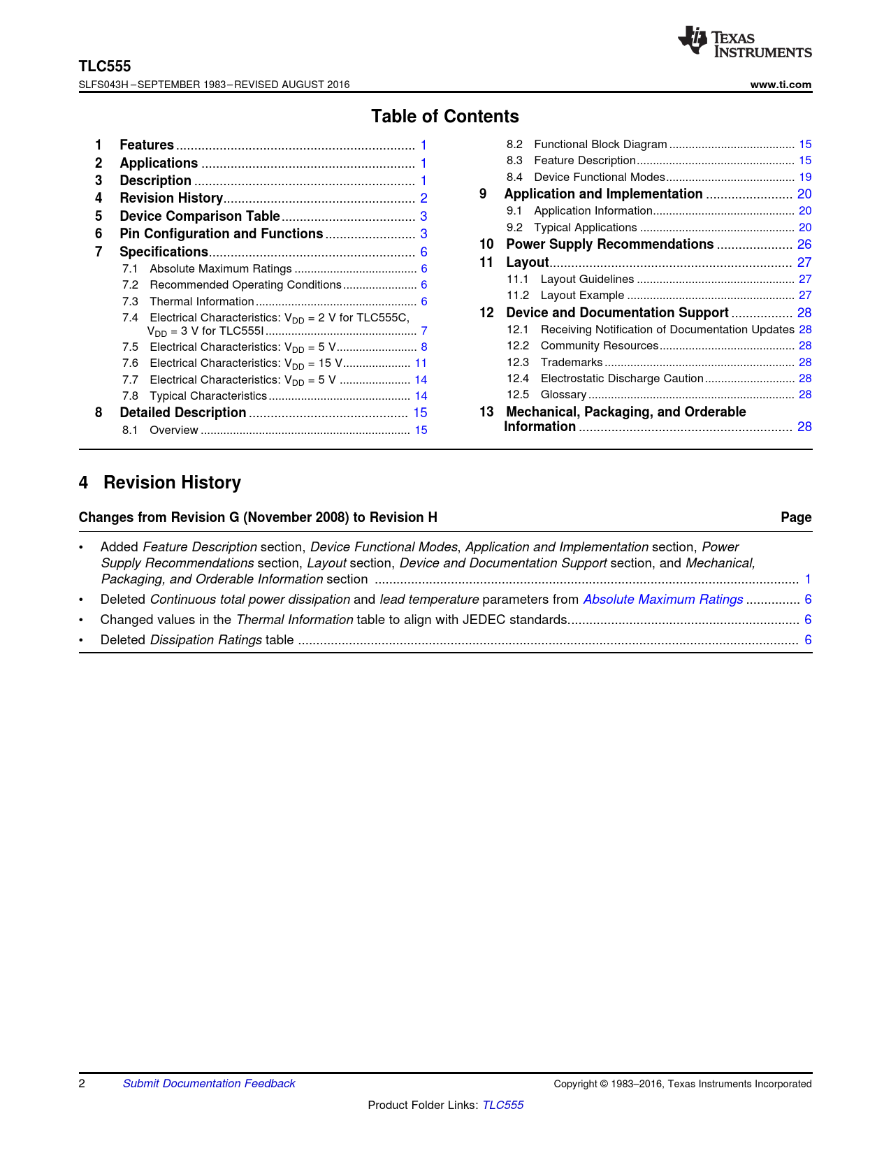 | Pages / Page | 41 / 2 — TLC555. www.ti.com. Table of Contents. Features. Applications. … |