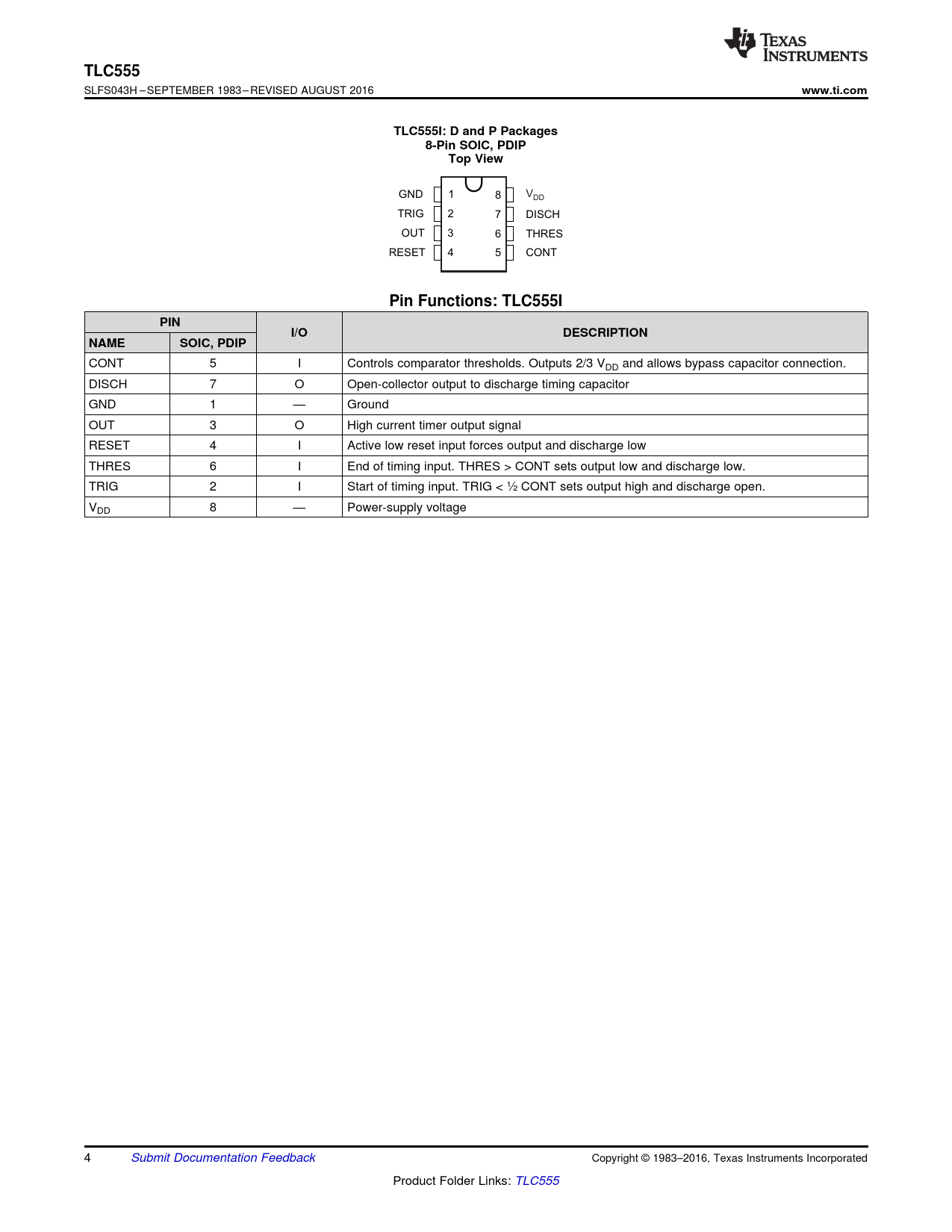 Pin Functions: TLC555I PIN I/O DESCRIPTION NAME SOIC, PDIP