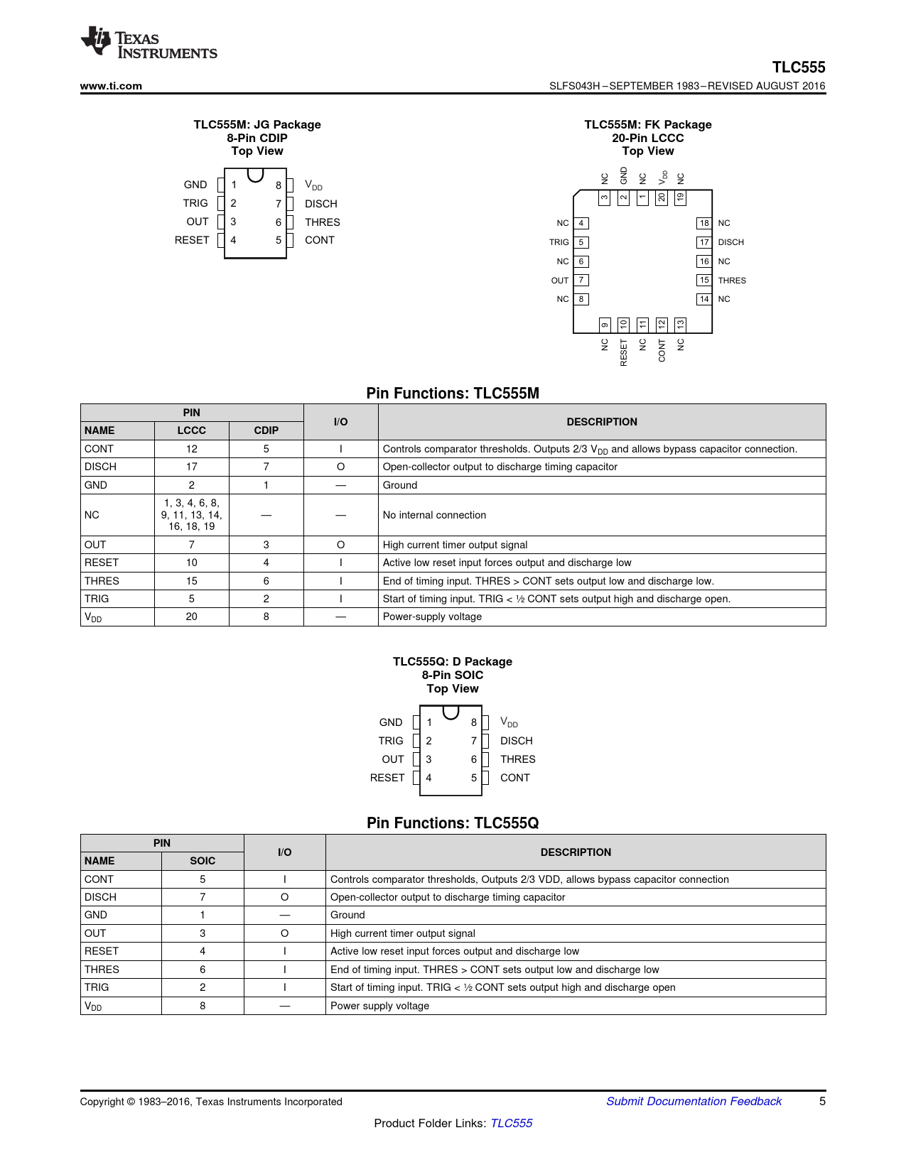 Pin Functions: TLC555M PIN I/O DESCRIPTION NAME LCCC CDIP