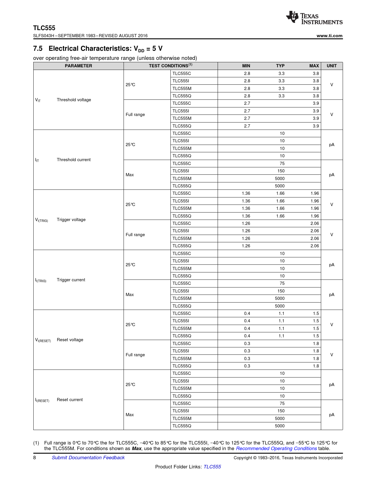TLC555. www.ti.com. 7.5 Electrical Characteristics: VDD = 5 V. PARAMETER. TEST CONDITIONS(1). MIN. TYP. MAX. UNIT. Max