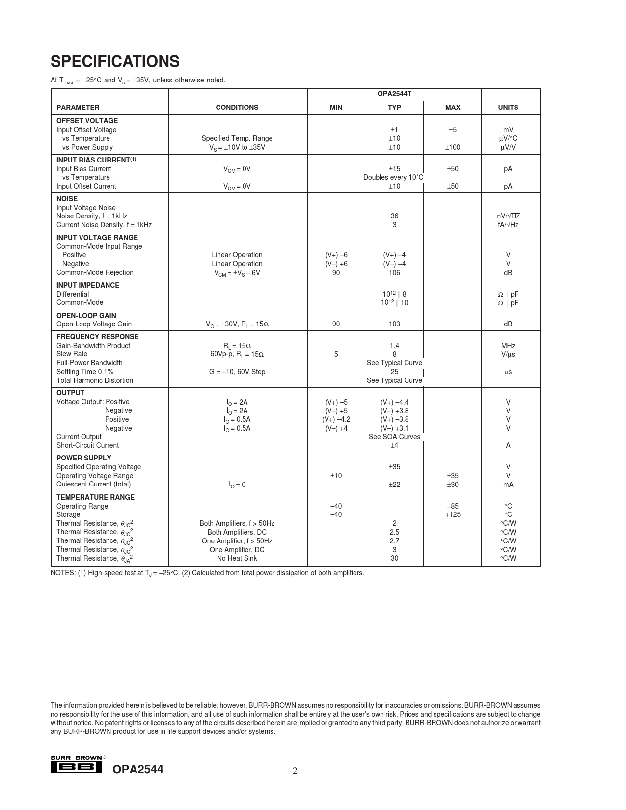 SPECIFICATIONS At T = +25°C and V = ±35V, unless otherwise noted. CASE S OPA2544TPARAMETERCONDITIONSMINTYPMAXUNITSOFFSET VOLTAGE Input Offset Voltage ±1 ±5 mV vs Temperature Specified Temp. Range ±10 µV/°C vs Power Supply VS = ±10V to ±35V ±10 ±100 µV/V INPUT BIAS CURRENT(1) Input Bias Current VCM = 0V ±15 ±50 pA vs Temperature Doubles every 10˚C Input Offset Current VCM = 0V ±10 ±50 pA NOISE Input Voltage Noise Noise Density, f = 1kHz 36 nV/√Hz Current Noise Density, f = 1kHz 3 fA/√Hz INPUT VOLTAGE RANGE Common-Mode Input Range Positive Linear Operation (V+) –6 (V+) –4 V Negative Linear Operation (V–) +6 (V–) +4 V Common-Mode Rejection VCM = ±VS – 6V 90 106 dB INPUT IMPEDANCE Differential 1012 || 8 Ω || pF Common-Mode 1012 || 10 Ω || pF OPEN-LOOP GAIN Open-Loop Voltage Gain VO = ±30V, RL = 15Ω 90 103 dB FREQUENCY RESPONSE Gain-Bandwidth Product RL = 15Ω 1.4 MHz Slew Rate 60Vp-p, RL = 15Ω 5 8 V/µs Full-Power Bandwidth See Typical Curve Settling Time 0.1% G = –10, 60V Step 25 µs Total Harmonic Distortion See Typical Curve OUTPUT Voltage Output: Positive IO = 2A (V+) –5 (V+) –4.4 V Negative IO = 2A (V–) +5 (V–) +3.8 V Positive IO = 0.5A (V+) –4.2 (V+) –3.8 V Negative IO = 0.5A (V–) +4 (V–) +3.1 V Current Output See SOA Curves Short-Circuit Current ±4 A POWER SUPPLY Specified Operating Voltage ±35 V Operating Voltage Range ±10 ±35 V Quiescent Current (total) IO = 0 ±22 ±30 mA TEMPERATURE RANGE Operating Range –40 +85 °C Storage –40 +125 °C Thermal Resistance, θ 2 JC Both Amplifiers, f > 50Hz 2 °C/W Thermal Resistance, θ 2 JC Both Amplifiers, DC 2.5 °C/W Thermal Resistance, θ 2 JC One Amplifier, f > 50Hz 2.7 °C/W Thermal Resistance, θ 2 JC One Amplifier, DC 3 °C/W Thermal Resistance, θ 2 JA No Heat Sink 30 °C/W NOTES: (1) High-speed test at TJ = +25°C. (2) Calculated from total power dissipation of both amplifiers. The information provided herein is believed to be reliable; however, BURR-BROWN assumes no responsibility for inaccuracies or omissions. BURR-BROWN assumes no responsibility for the use of this information, and all use of such information shall be entirely at the user’s own risk. Prices and specifications are subject to change without notice. No patent rights or licenses to any of the circuits described herein are implied or granted to any third party. BURR-BROWN does not authorize or warrant any BURR-BROWN product for use in life support devices and/or systems. ® OPA2544 2