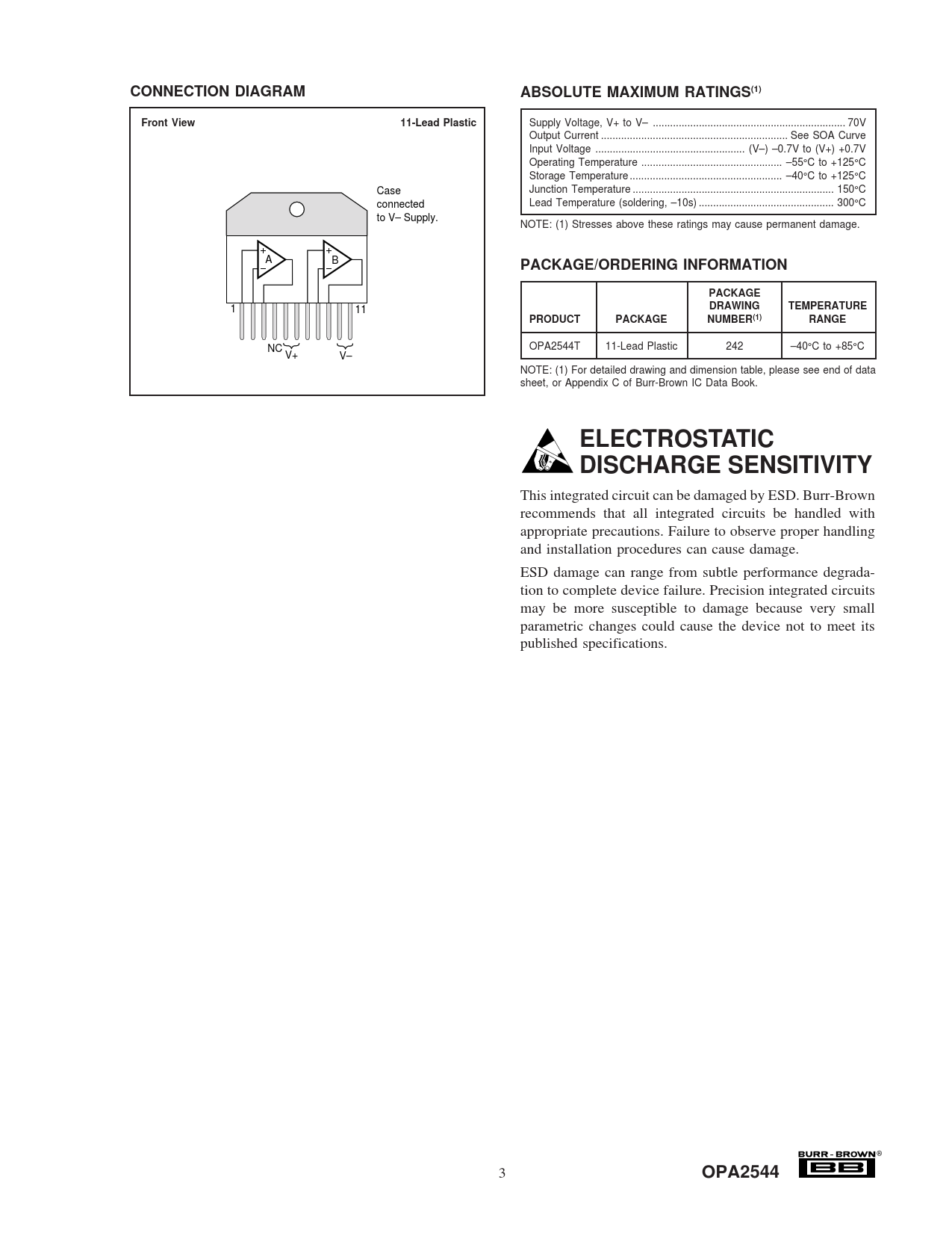 OPA2544T 11-Lead Plastic 242 –40 NC °C to +85°C V+ V– NOTE: (1) For detailed drawing and dimension table, please see end of data sheet, or Appendix C of Burr-Brown IC Data Book.