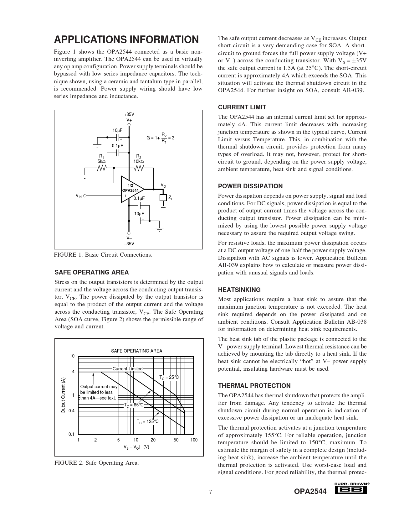 APPLICATIONS INFORMATION. CURRENT LIMIT. 1/2. POWER DISSIPATION. OPA2544. SAFE OPERATING AREA. HEATSINKING. THERMAL PROTECTION