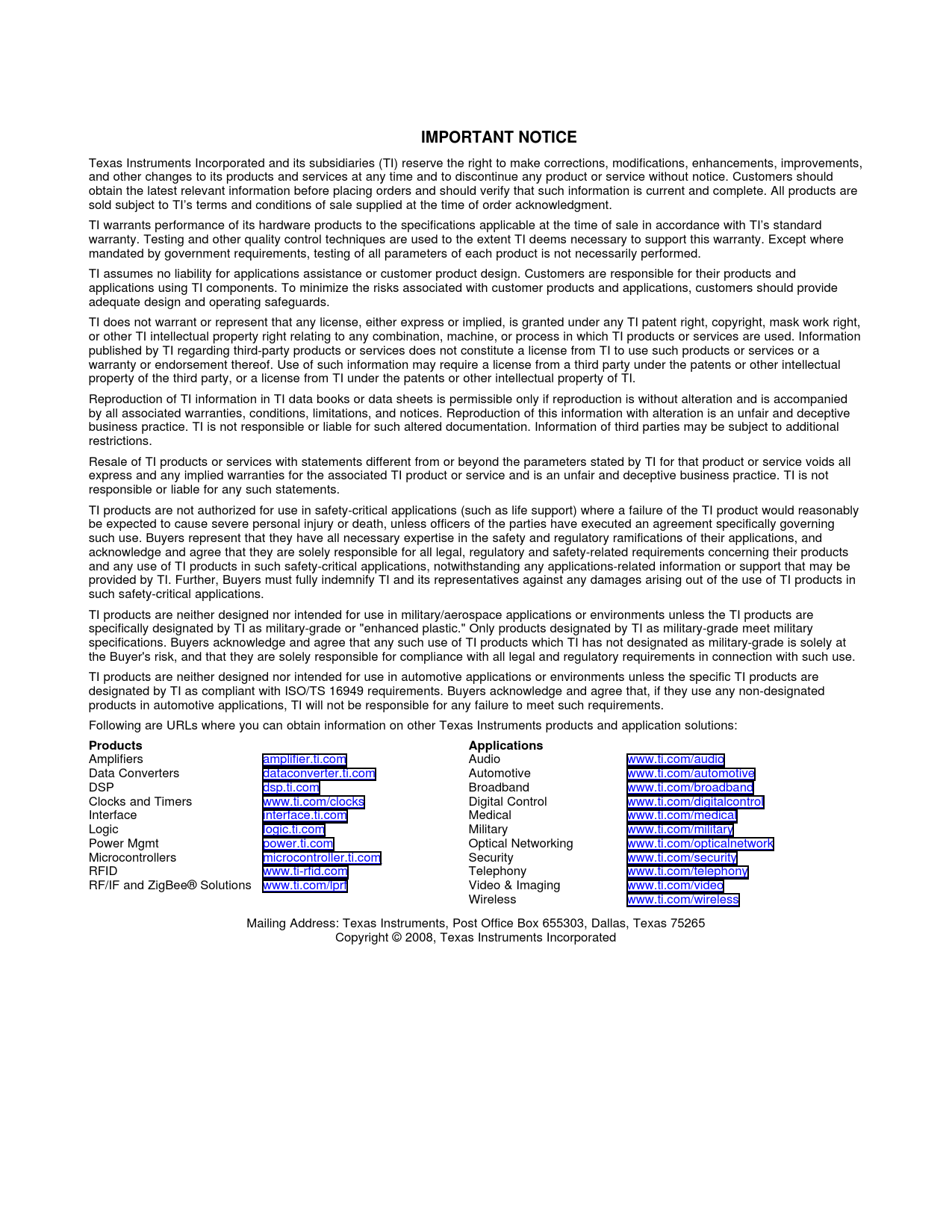 Amplifiers amplifier.ti.com Audio www.ti.com/audio Data Converters dataconverter.ti.com Automotive www.ti.com/automotive DSP dsp.ti.com Broadband www.ti.com/broadband Clocks and Timers www.ti.com/clocks Digital Control www.ti.com/digitalcontrol Interface interface.ti.com Medical www.ti.com/medical Logic logic.ti.com Military www.ti.com/military Power Mgmt power.ti.com Optical Networking www.ti.com/opticalnetwork Microcontrollers microcontroller.ti.com Security www.ti.com/security RFID www.ti-rfid.com Telephony www.ti.com/telephony RF/IF and ZigBee® Solutions www.ti.com/lprf Video & Imaging www.ti.com/video Wireless www.ti.com/wireless Mailing Address: Texas Instruments, Post Office Box 655303, Dallas, Texas 75265 Copyright © 2008, Texas Instruments Incorporated