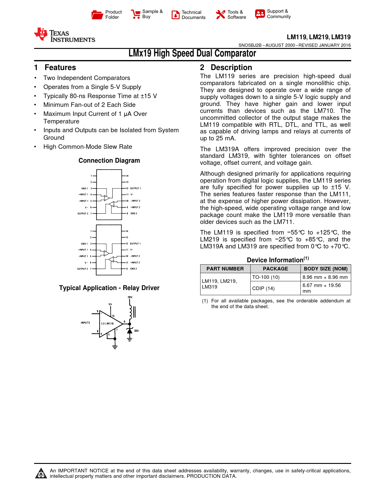 LM119,. LM219. , LM319. LMx19 High Speed Dual Comparator. 1 Features. 2 Description. Connection Diagram. Device Information(1)