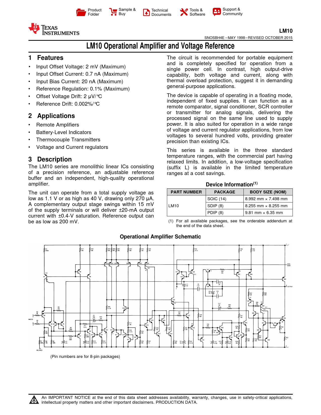 LM10. LM10 Operational Amplifier and Voltage Reference. 1 Features. 2 Applications. 3 Description. Device Information(1)