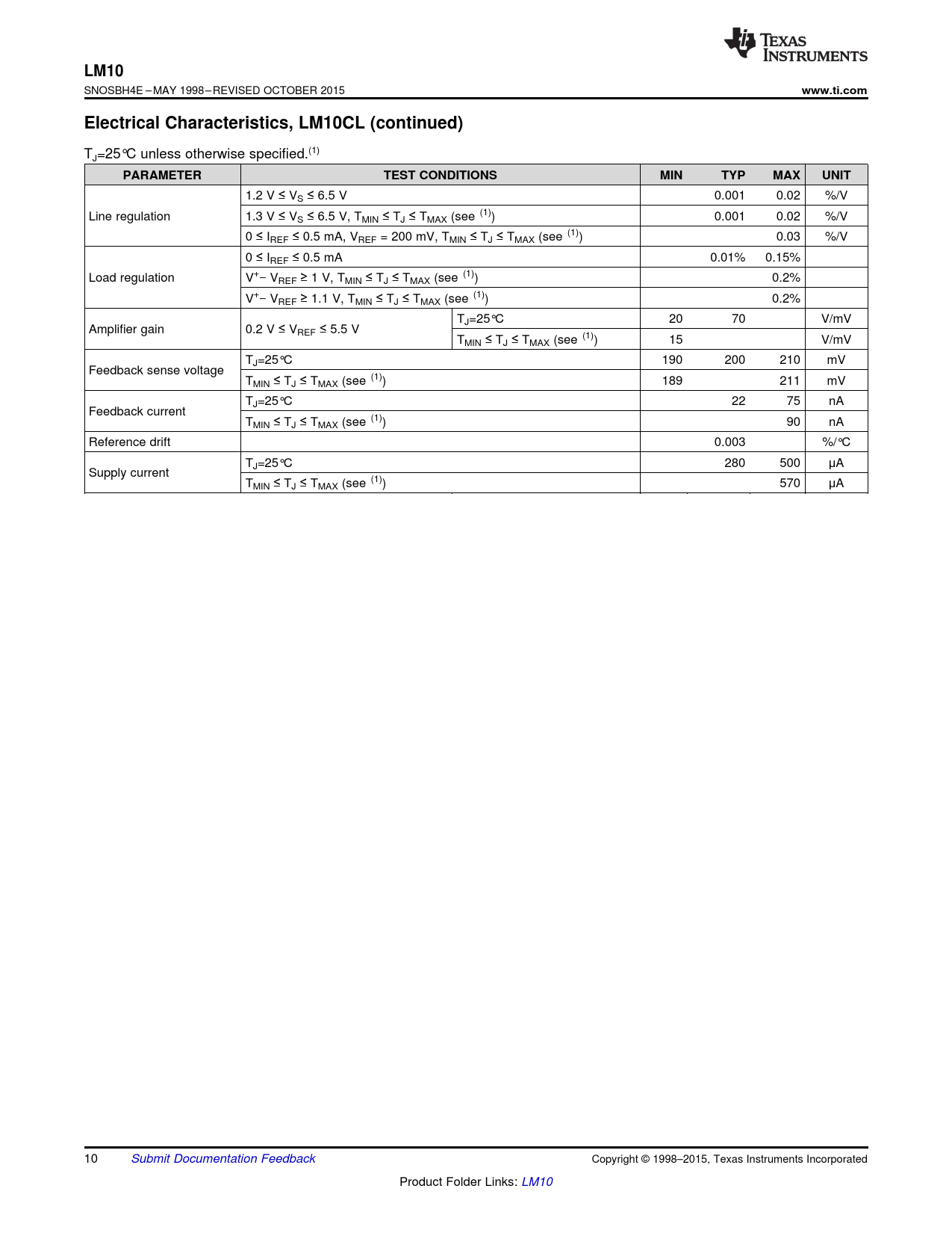 1.2 V ≤ VS ≤ 6.5 V 0.001 0.02 %/V Line regulation 1.3 V ≤ VS ≤ 6.5 V, TMIN ≤ TJ ≤ TMAX (see (1)) 0.001 0.02 %/V 0 ≤ IREF ≤ 0.5 mA, VREF = 200 mV, TMIN ≤ TJ ≤ TMAX (see (1)) 0.03 %/V 0 ≤ IREF ≤ 0.5 mA 0.01% 0.15% Load regulation V+− VREF ≥ 1 V, TMIN ≤ TJ ≤ TMAX (see (1)) 0.2% V+− VREF ≥ 1.1 V, TMIN ≤ TJ ≤ TMAX (see (1)) 0.2% TJ=25°C 20 70 V/mV Amplifier gain 0.2 V ≤ VREF ≤ 5.5 V TMIN ≤ TJ ≤ TMAX (see (1)) 15 V/mV TJ=25°C 190 200 210 mV Feedback sense voltage TMIN ≤ TJ ≤ TMAX (see (1)) 189 211 mV TJ=25°C 22 75 nA Feedback current TMIN ≤ TJ ≤ TMAX (see (1)) 90 nA Reference drift 0.003 %/°C TJ=25°C 280 500 μA Supply current TMIN ≤ TJ ≤ TMAX (see (1)) 570 μA 10 Submit Documentation Feedback Copyright © 1998–2015, Texas Instruments Incorporated Product Folder Links: LM10 Document Outline 1 Features 2 Applications 3 Description Table of Contents 4 Revision History 5 Pin Configuration and Functions 6 Specifications 6.1 Absolute Maximum Ratings 6.2 Recommended Operating Conditions 6.3 Thermal Information 6.4 Electrical Characteristics LM10/LM10B 6.5 Electrical Characteristics, LM10C 6.6 Electrical Characteristics, LM10BL 6.7 Electrical Characteristics, LM10CL 6.8 Typical Characteristics 6.8.1 Typical Characteristics (Op Amp) 6.8.2 Typical Characteristics (Reference) 7 Detailed Description 7.1 Overview 7.2 Functional Block Diagram 7.3 Feature Description 7.3.1 Operating Characteristics 7.3.2 Common-Mode Voltage Range 7.3.3 Operational Amplifier 7.3.4 Voltage Reference 7.4 Device Functional Modes 7.4.1 Floating Mode 7.4.2 Linear Operation 8 Application and Implementation 8.1 Application Information 8.2 Typical Application 8.2.1 Design Requirements 8.2.2 Detailed Design Procedure 8.2.3 Application Curve 8.3 System Examples 8.3.1 Operational Amplifier Offset Adjustment 8.3.2 Positive Regulators 8.3.3 Reference and Internal Regulator 9 Power Supply Recommendations 10 Layout 10.1 Layout Guidelines 10.2 Layout Example 11 Device and Documentation Support 11.1 Device Support 11.1.1 Device Nomenclature 11.1.1.1 Definition of Terms 11.2 Documentation Support 11.2.1 Related Documentation 11.3 Community Resources 11.4 Trademarks 11.5 Electrostatic Discharge Caution 11.6 Glossary 12 Mechanical, Packaging, and Orderable Information