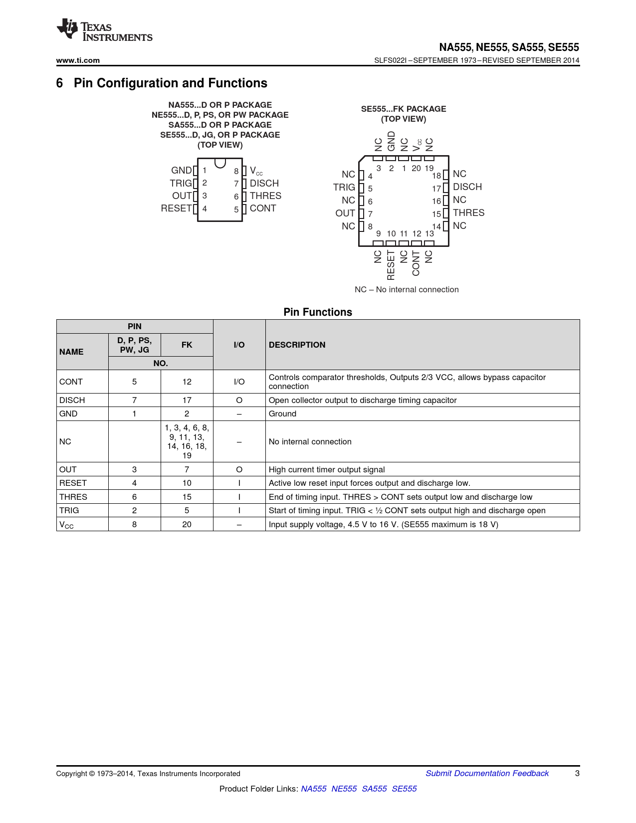 | Pages / Page | 36 / 3 — NA555,. NE555,. SA555,. SE555. www.ti.com. 6 Pin Configuration and … |