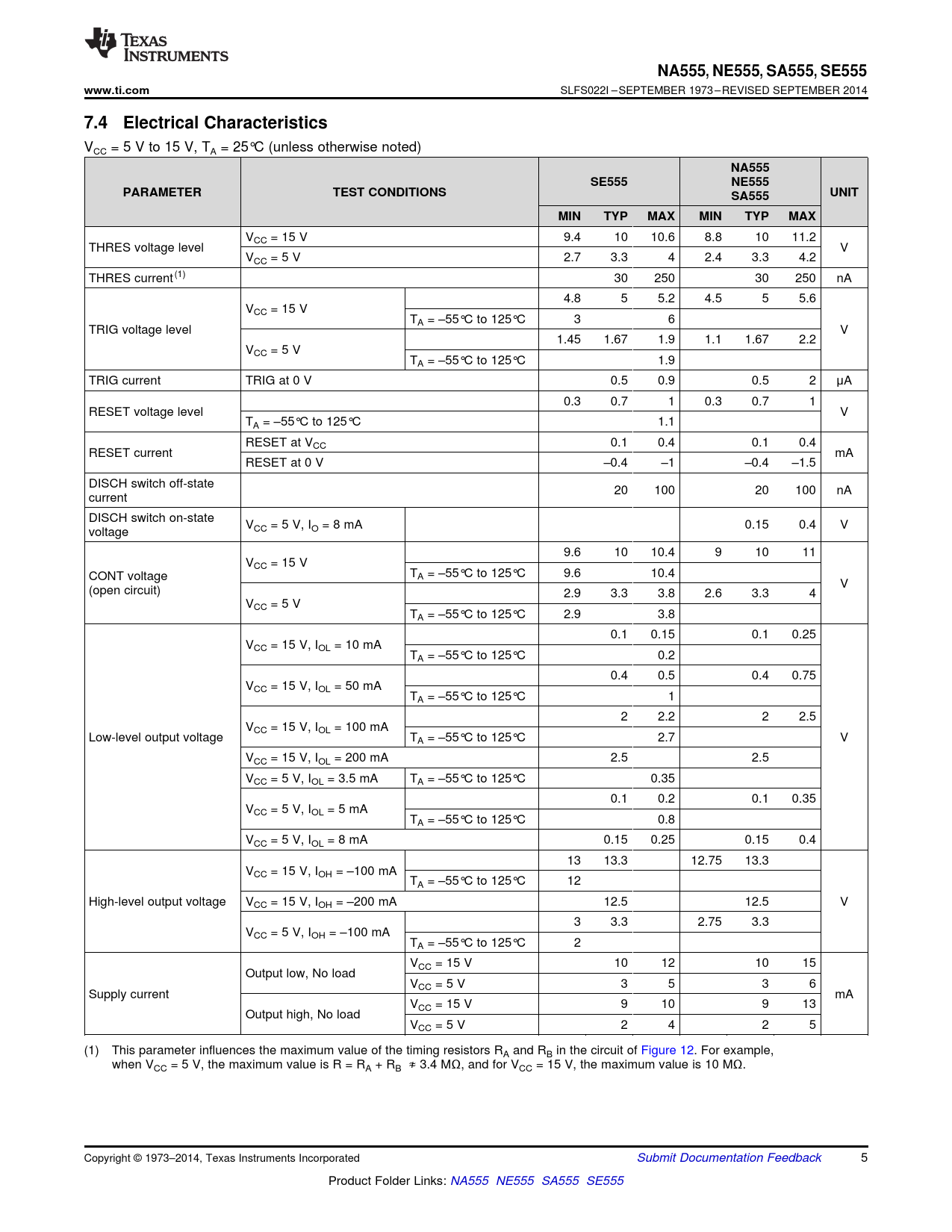 NA555,. NE555,. SA555,. SE555. www.ti.com. 7.4 Electrical Characteristics. NA555. NE555. PARAMETER. TEST CONDITIONS. UNIT. SA555. MIN. TYP. MAX