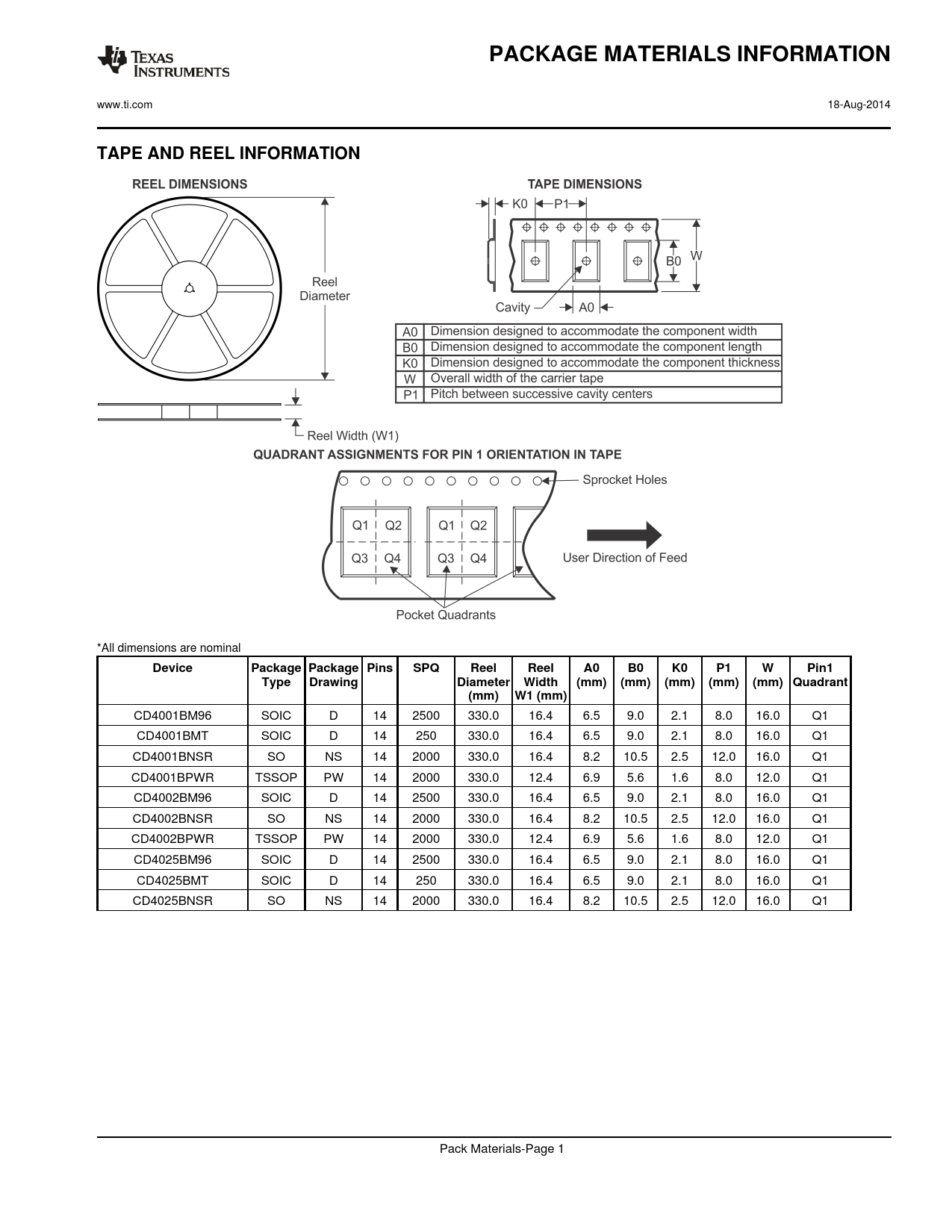 CD4001BM96 SOIC D 14 2500 330.0 16.4 6.5 9.0 2.1 8.0 16.0 Q1 CD4001BMT SOIC D 14 250 330.0 16.4 6.5 9.0 2.1 8.0 16.0 Q1 CD4001BNSR SO NS 14 2000 330.0 16.4 8.2 10.5 2.5 12.0 16.0 Q1 CD4001BPWR TSSOP PW 14 2000 330.0 12.4 6.9 5.6 1.6 8.0 12.0 Q1 CD4002BM96 SOIC D 14 2500 330.0 16.4 6.5 9.0 2.1 8.0 16.0 Q1 CD4002BNSR SO NS 14 2000 330.0 16.4 8.2 10.5 2.5 12.0 16.0 Q1 CD4002BPWR TSSOP PW 14 2000 330.0 12.4 6.9 5.6 1.6 8.0 12.0 Q1 CD4025BM96 SOIC D 14 2500 330.0 16.4 6.5 9.0 2.1 8.0 16.0 Q1 CD4025BMT SOIC D 14 250 330.0 16.4 6.5 9.0 2.1 8.0 16.0 Q1 CD4025BNSR SO NS 14 2000 330.0 16.4 8.2 10.5 2.5 12.0 16.0 Q1 Pack Materials-Page 1