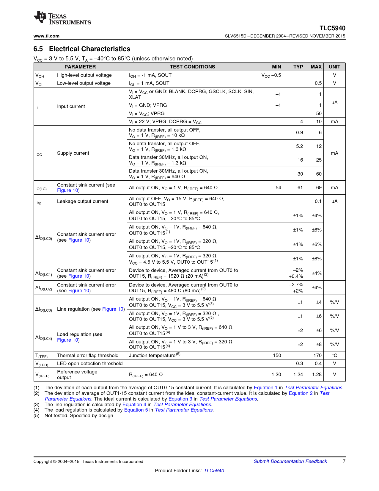 TLC5940. www.ti.com. 6.5 Electrical Characteristics. PARAMETER. TEST CONDITIONS. MIN. TYP. MAX. UNIT
