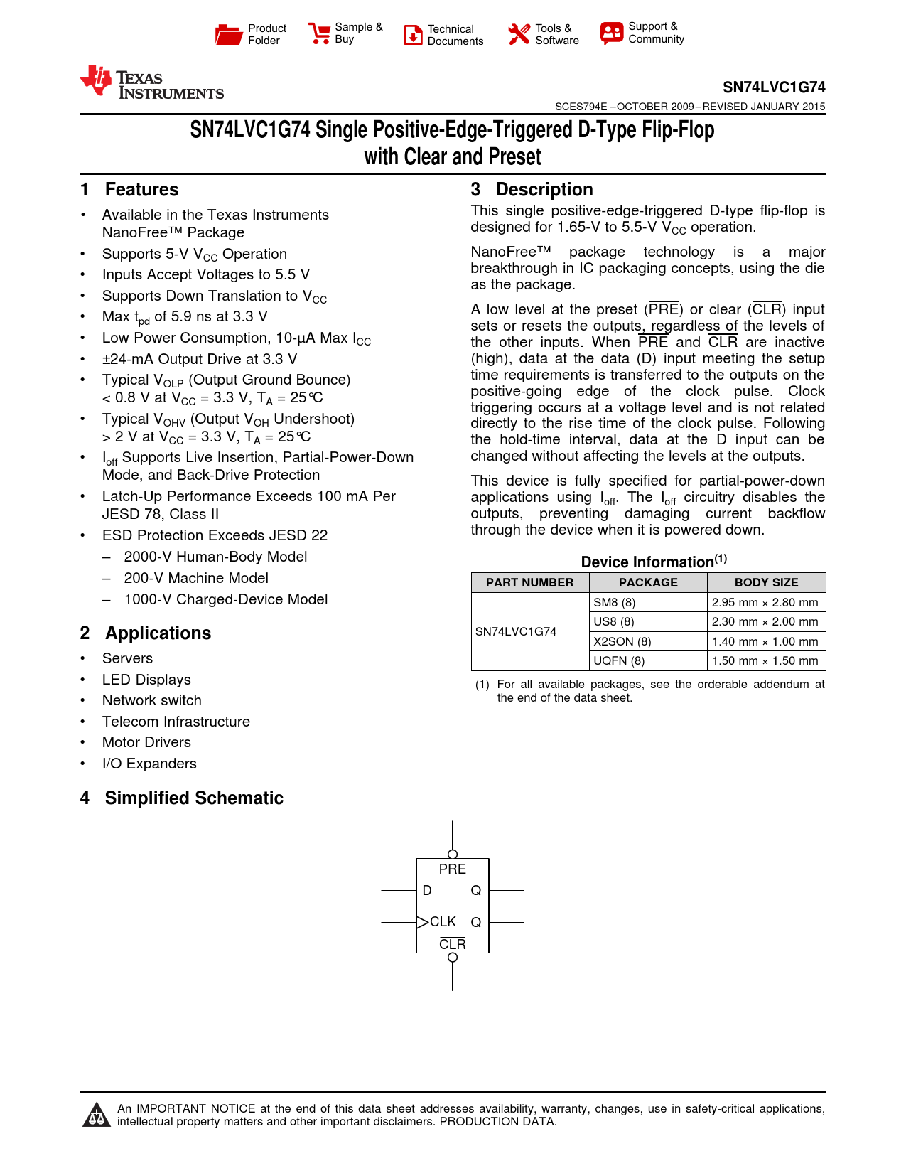 SN74LVC1G74. SN74LVC1G74 Single Positive-Edge-Triggered D-Type Flip-Flop. with Clear and Preset. 1 Features. 3 Description