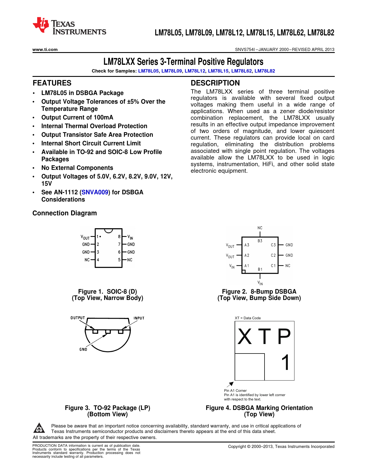 LM78L05. , LM78L09,. LM78L12. , LM78L15. , LM78L62,. LM78L82. www.ti.com. LM78LXX Series 3-Terminal Positive Regulators