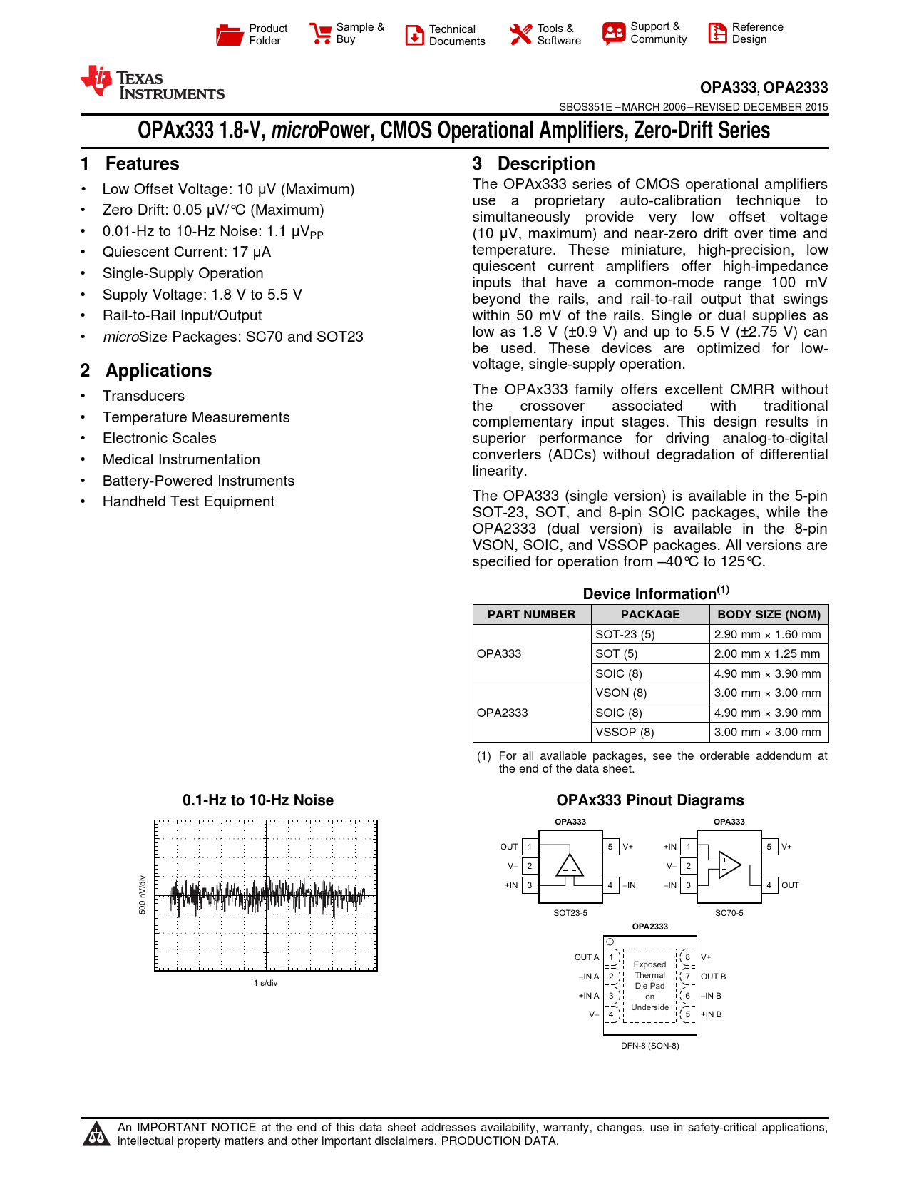 OPA333,. OPA2333. OPAx333 1.8-V, micro. Power, CMOS Operational Amplifiers, Zero-Drift Series. 1 Features. 3 Description