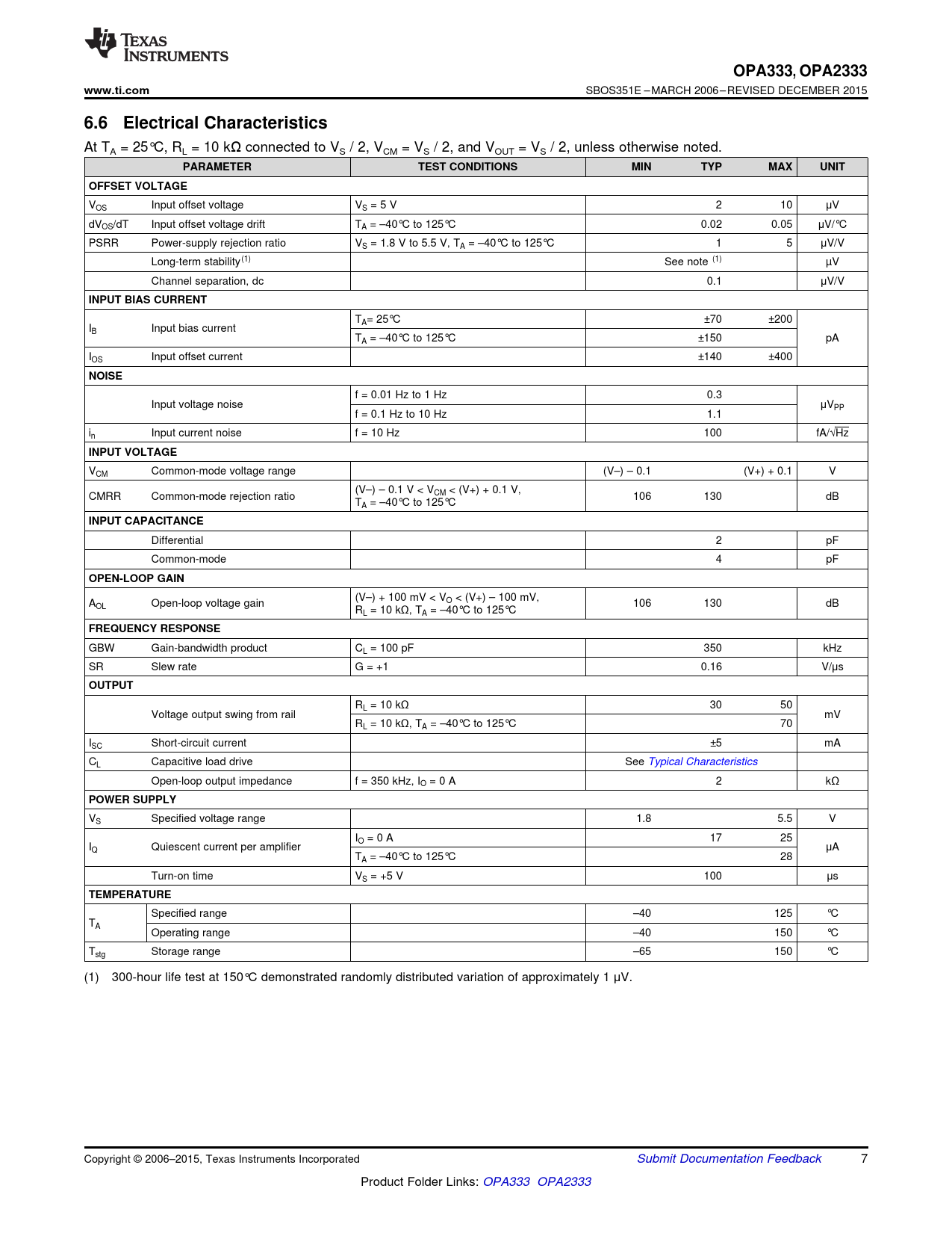 | Pages / Page | 45 / 7 — OPA333,. OPA2333. www.ti.com. 6.6 Electrical Characteristics. PARAMETER. … |