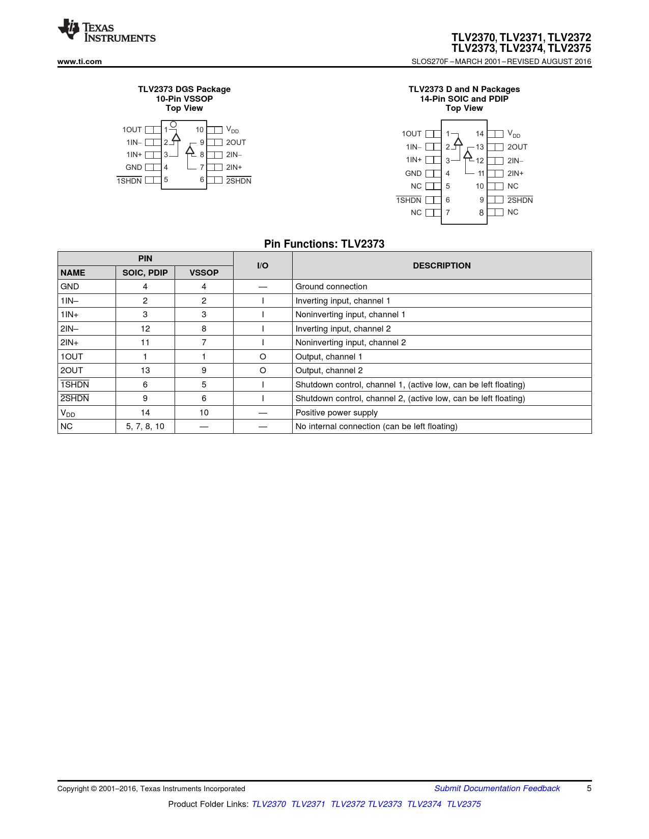 Pin Functions: TLV2373 PIN I/O DESCRIPTION NAME SOIC, PDIP VSSOP