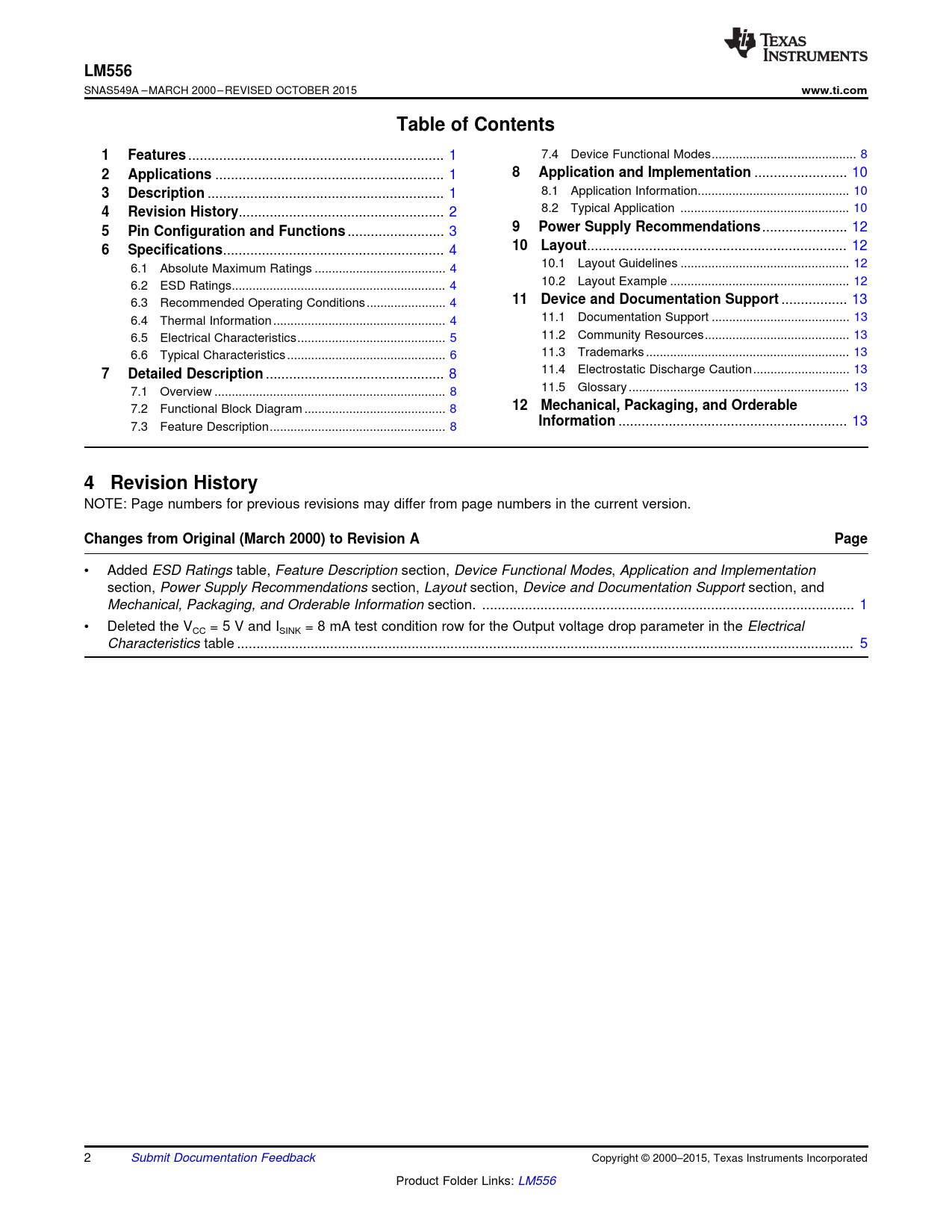 • Added ESD Ratings table, Feature Description section, Device Functional Modes, Application and Implementation section, Power Supply Recommendations section, Layout section, Device and Documentation Support section, and Mechanical, Packaging, and Orderable Information section. .. 1 • Deleted the VCC = 5 V and ISINK = 8 mA test condition row for the Output voltage drop parameter in the Electrical Characteristics table ... 5 2 Submit Documentation Feedback Copyright © 2000–2015, Texas Instruments Incorporated Product Folder Links: LM556 Document Outline 1 Features 2 Applications 3 Description Table of Contents 4 Revision History 5 Pin Configuration and Functions 6 Specifications 6.1 Absolute Maximum Ratings 6.2 ESD Ratings 6.3 Recommended Operating Conditions 6.4 Thermal Information 6.5 Electrical Characteristics 6.6 Typical Characteristics 7 Detailed Description 7.1 Overview 7.2 Functional Block Diagram 7.3 Feature Description 7.3.1 Operating Characteristics 7.3.2 Timing from Microseconds Through Hours 7.4 Device Functional Modes 7.4.1 Monostable Mode 7.4.2 Astable (Free-Running) Mode 8 Application and Implementation 8.1 Application Information 8.2 Typical Application 8.2.1 Design Requirements 8.2.2 Detailed Design Procedure 8.2.3 Application Curve 9 Power Supply Recommendations 10 Layout 10.1 Layout Guidelines 10.2 Layout Example 11 Device and Documentation Support 11.1 Documentation Support 11.1.1 Related Documentation 11.2 Community Resources 11.3 Trademarks 11.4 Electrostatic Discharge Caution 11.5 Glossary 12 Mechanical, Packaging, and Orderable Information