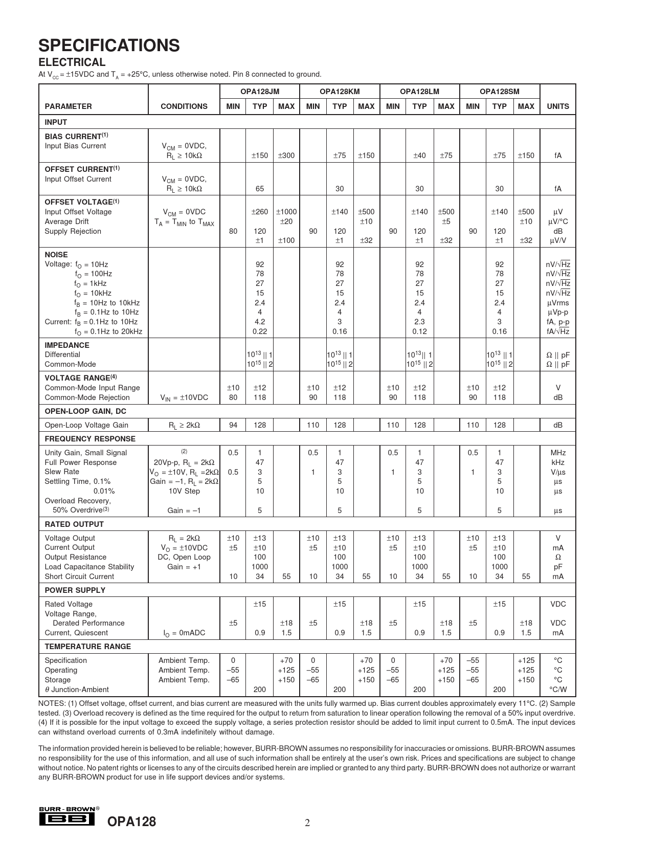 SPECIFICATIONS ELECTRICAL At V = ±15VDC and T = +25°C, unless otherwise noted. Pin 8 connected to ground. CC A OPA128JMOPA128KMOPA128LMOPA128SMPARAMETERCONDITIONSMINTYPMAXMINTYPMAXMINTYPMAXMINTYPMAXUNITSINPUTBIAS CURRENT(1) Input Bias Current VCM = 0VDC, RL ≥ 10kΩ ±150 ±300 ±75 ±150 ±40 ±75 ±75 ±150 fA OFFSET CURRENT(1) Input Offset Current VCM = 0VDC, RL ≥ 10kΩ 65 30 30 30 fA OFFSET VOLTAGE(1) Input Offset Voltage VCM = 0VDC ±260 ±1000 ±140 ±500 ±140 ±500 ±140 ±500 µV Average Drift T ± A = TMIN to TMAX 20 ±10 ±5 ±10 µV/°C Supply Rejection 80 120 90 120 90 120 90 120 dB ±1 ±100 ±1 ±32 ±1 ±32 ±1 ±32 µV/V NOISE Voltage: fO = 10Hz 92 92 92 92 nV/√Hz fO = 100Hz 78 78 78 78 nV/√Hz fO = 1kHz 27 27 27 27 nV/√Hz fO = 10kHz 15 15 15 15 nV/√Hz fB = 10Hz to 10kHz 2.4 2.4 2.4 2.4 µVrms fB = 0.1Hz to 10Hz 4 4 4 4 µVp-p Current: fB = 0.1Hz to 10Hz 4.2 3 2.3 3 fA, p-p fO = 0.1Hz to 20kHz 0.22 0.16 0.12 0.16 fA/√Hz IMPEDANCE Differential 1013 || 1 1013 || 1 1013 || 1 1013 || 1 Ω || pF Common-Mode 1015 || 2 1015 || 2 1015 || 2 1015 || 2 Ω || pF VOLTAGE RANGE(4) Common-Mode Input Range ±10 ±12 ±10 ±12 ±10 ±12 ±10 ±12 V Common-Mode Rejection VIN = ±10VDC 80 118 90 118 90 118 90 118 dB OPEN-LOOP GAIN, DC Open-Loop Voltage Gain RL ≥ 2kΩ 94 128 110 128 110 128 110 128 dB FREQUENCY RESPONSE Unity Gain, Small Signal (2) 0.5 1 0.5 1 0.5 1 0.5 1 MHz Full Power Response 20Vp-p, RL = 2kΩ 47 47 47 47 kHz Slew Rate VO = ±10V, RL = 2kΩ 0.5 3 1 3 1 3 1 3 V/µs Settling Time, 0.1% Gain = –1, RL = 2kΩ 5 5 5 5 µs 0.01% 10V Step 10 10 10 10 µs Overload Recovery, 50% Overdrive(3) Gain = –1 5 5 5 5 µs RATED OUTPUT Voltage Output RL = 2kΩ ±10 ±13 ±10 ±13 ±10 ±13 ±10 ±13 V Current Output VO = ±10VDC ±5 ±10 ±5 ±10 ±5 ±10 ±5 ±10 mA Output Resistance DC, Open Loop 100 100 100 100 Ω Load Capacitance Stability Gain = +1 1000 1000 1000 1000 pF Short Circuit Current 10 34 55 10 34 55 10 34 55 10 34 55 mA POWER SUPPLY Rated Voltage ±15 ±15 ±15 ±15 VDC Voltage Range, Derated Performance ±5 ±18 ±5 ±18 ±5 ±18 ±5 ±18 VDC Current, Quiescent IO = 0mADC 0.9 1.5 0.9 1.5 0.9 1.5 0.9 1.5 mA TEMPERATURE RANGE Specification Ambient Temp. 0 +70 0 +70 0 +70 –55 +125 °C Operating Ambient Temp. –55 +125 –55 +125 –55 +125 –55 +125 °C Storage Ambient Temp. –65 +150 –65 +150 –65 +150 –65 +150 °C θ Junction-Ambient 200 200 200 200 °C/W NOTES: (1) Offset voltage, offset current, and bias current are measured with the units fully warmed up. Bias current doubles approximately every 11°C. (2) Sample tested. (3) Overload recovery is defined as the time required for the output to return from saturation to linear operation following the removal of a 50% input overdrive. (4) If it is possible for the input voltage to exceed the supply voltage, a series protection resistor should be added to limit input current to 0.5mA. The input devices can withstand overload currents of 0.3mA indefinitely without damage. The information provided herein is believed to be reliable; however, BURR-BROWN assumes no responsibility for inaccuracies or omissions. BURR-BROWN assumes no responsibility for the use of this information, and all use of such information shall be entirely at the user’s own risk. Prices and specifications are subject to change without notice. No patent rights or licenses to any of the circuits described herein are implied or granted to any third party. BURR-BROWN does not authorize or warrant any BURR-BROWN product for use in life support devices and/or systems. ® OPA128 2