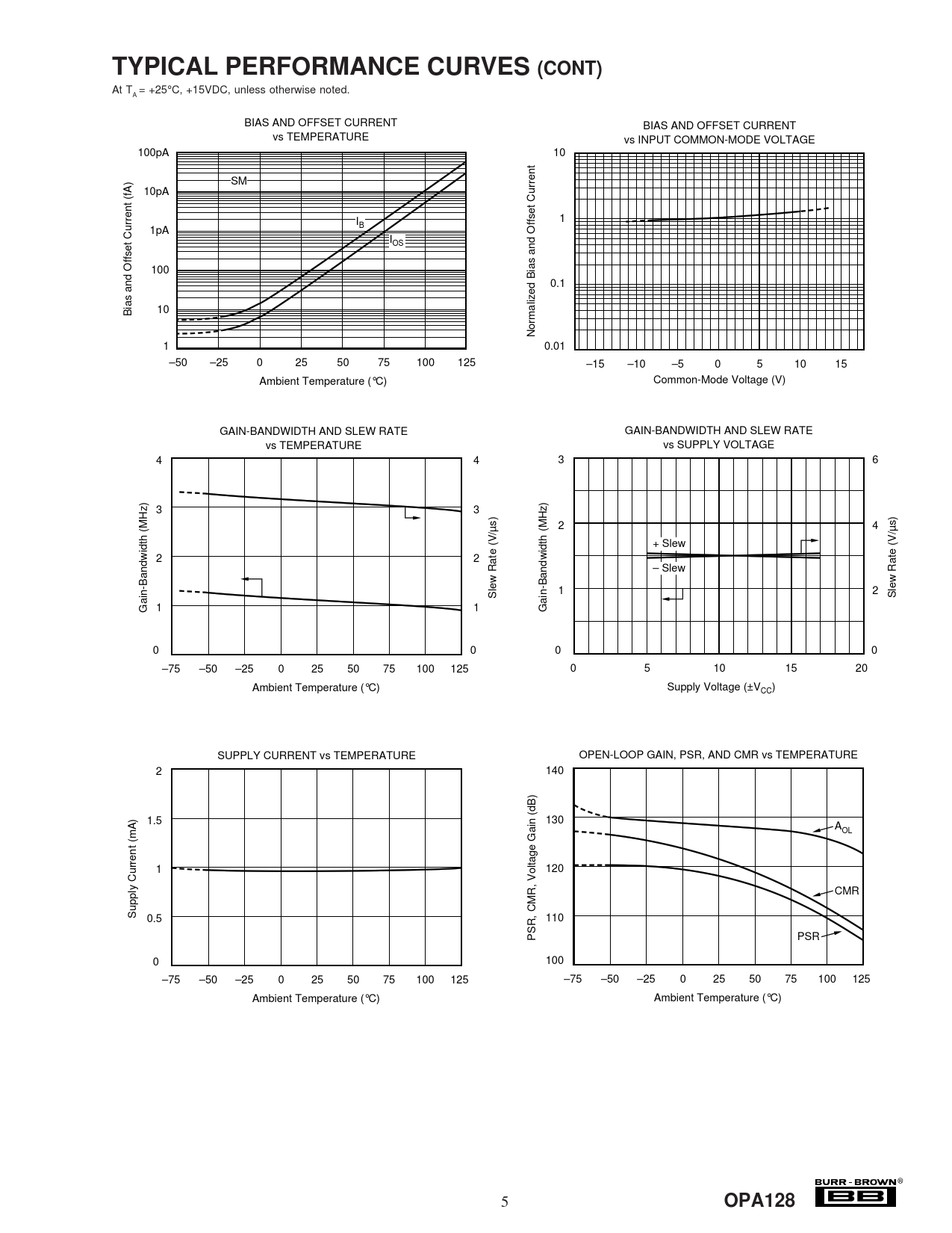 TYPICAL PERFORMANCE CURVES (CONT) At T = +25°C, +15VDC, unless otherwise noted. A BIAS AND OFFSET CURRENT BIAS AND OFFSET CURRENT vs TEMPERATURE vs INPUT COMMON-MODE VOLTAGE 100pA 10 SM 10pA I 1 B 1pA IOS 100 0.1 10 Bias and Offset Current (fA) Normalized Bias and Offset Current 1 0.01 –50 –25 0 25 50 75 100 125 –15 –10 –5 0 5 10 15 Ambient Temperature (°C) Common-Mode Voltage (V) GAIN-BANDWIDTH AND SLEW RATE GAIN-BANDWIDTH AND SLEW RATE vs TEMPERATURE vs SUPPLY VOLTAGE 4 4 3 6 3 3 2 4 + Slew 2 2 – Slew Slew Rate (V/µs) 1 2 Slew Rate (V/µs) Gain-Bandwidth (MHz) 1 1 Gain-Bandwidth (MHz) 0 0 0 0 –75 –50 –25 0 25 50 75 100 125 0 5 10 15 20 Ambient Temperature (°C) Supply Voltage (±V ) CC SUPPLY CURRENT vs TEMPERATURE OPEN-LOOP GAIN, PSR, AND CMR vs TEMPERATURE 2 140 1.5 130 AOL 1 120 CMR Supply Current (mA) 0.5 110 PSR, CMR, Voltage Gain (dB) PSR 0 100 –75 –50 –25 0 25 50 75 100 125 –75 –50 –25 0 25 50 75 100 125 Ambient Temperature (°C) Ambient Temperature (°C) ® 5 OPA128