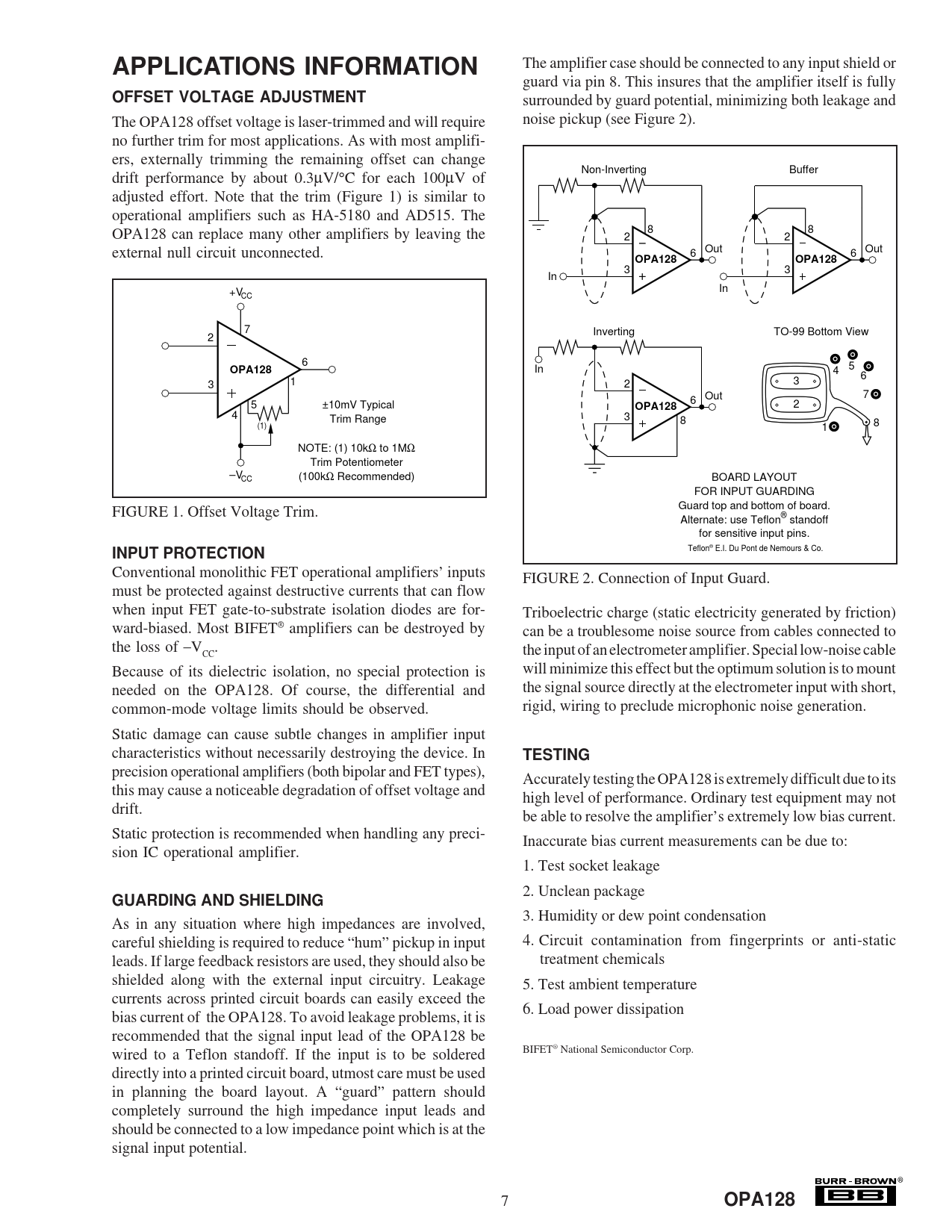 APPLICATIONS INFORMATION The amplifier case should be connected to any input shield or guard via pin 8. This insures that the amplifier itself is fully OFFSET VOLTAGE ADJUSTMENT surrounded by guard potential, minimizing both leakage and The OPA128 offset voltage is laser-trimmed and will require noise pickup (see Figure 2). no further trim for most applications. As with most amplifi- ers, externally trimming the remaining offset can change Non-Inverting Buffer drift performance by about 0.3µV/°C for each 100µV of adjusted effort. Note that the trim (Figure 1) is similar to operational amplifiers such as HA-5180 and AD515. The OPA128 can replace many other amplifiers by leaving the 8 8 2 2 external null circuit unconnected. 6 Out 6 Out OPA128OPA128 3 3 In In +VCC 7 Inverting TO-99 Bottom View 2 6 OPA128 In 4 5 6 3 1 2 3 7 6 Out 5 ±10mV Typical OPA128 2 4 3 Trim Range 8 8 (1) 1 NOTE: (1) 10kΩ to 1MΩ Trim Potentiometer –VCC (100kΩ Recommended) BOARD LAYOUT FOR INPUT GUARDING Guard top and bottom of board. FIGURE 1. Offset Voltage Trim. Alternate: use Teflon® standoff for sensitive input pins. Teflon® E.I. Du Pont de Nemours & Co. INPUT PROTECTION Conventional monolithic FET operational amplifiers’ inputs FIGURE 2. Connection of Input Guard. must be protected against destructive currents that can flow when input FET gate-to-substrate isolation diodes are for- Triboelectric charge (static electricity generated by friction) ward-biased. Most BIFET® amplifiers can be destroyed by can be a troublesome noise source from cables connected to the loss of –V . CC the input of an electrometer amplifier. Special low-noise cable will minimize this effect but the optimum solution is to mount Because of its dielectric isolation, no special protection is the signal source directly at the electrometer input with short, needed on the OPA128. Of course, the differential and rigid, wiring to preclude microphonic noise generation. common-mode voltage limits should be observed. Static damage can cause subtle changes in amplifier input characteristics without necessarily destroying the device. In TESTING precision operational amplifiers (both bipolar and FET types), Accurately testing the OPA128 is extremely difficult due to its this may cause a noticeable degradation of offset voltage and high level of performance. Ordinary test equipment may not drift. be able to resolve the amplifier’s extremely low bias current. Static protection is recommended when handling any preci- Inaccurate bias current measurements can be due to: sion IC operational amplifier. 1. Test socket leakage 2. Unclean package GUARDING AND SHIELDING 3. Humidity or dew point condensation As in any situation where high impedances are involved, careful shielding is required to reduce “hum” pickup in input 4. Circuit contamination from fingerprints or anti-static leads. If large feedback resistors are used, they should also be treatment chemicals shielded along with the external input circuitry. Leakage 5. Test ambient temperature currents across printed circuit boards can easily exceed the 6. Load power dissipation bias current of the OPA128. To avoid leakage problems, it is recommended that the signal input lead of the OPA128 be BIFET® National Semiconductor Corp. wired to a Teflon standoff. If the input is to be soldered directly into a printed circuit board, utmost care must be used in planning the board layout. A “guard” pattern should completely surround the high impedance input leads and should be connected to a low impedance point which is at the signal input potential. ® 7 OPA128