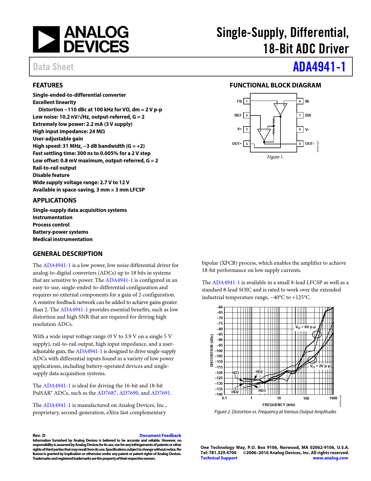 Single-Supply, Differential,. 18-Bit ADC Driver. Data Sheet. ADA4941-1. FEATURES. FUNCTIONAL BLOCK DIAGRAM