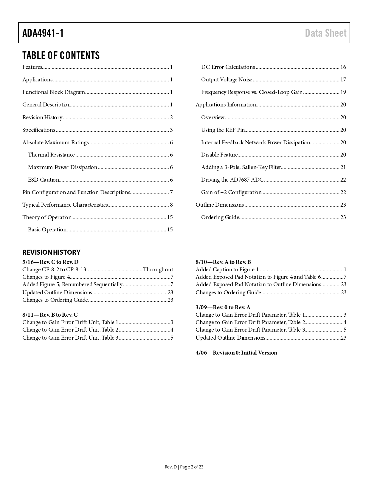 ADA4941-1 Data Sheet TABLE OF CONTENTS REVISION HISTORY 5/16—Rev C to Rev D 8/10—Rev A to Rev B 3/09—Rev 0 to Rev A