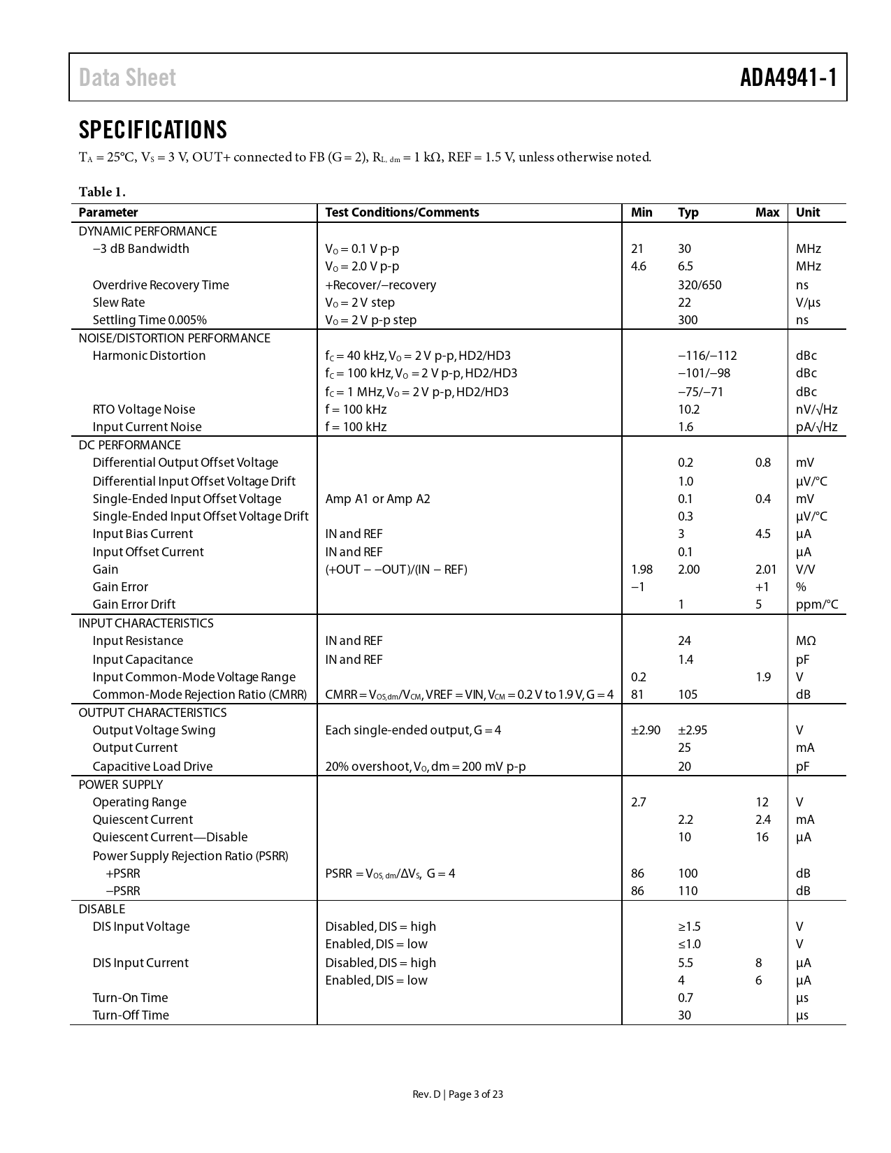 Data SheetADA4941-1SPECIFICATIONS TA = 25°C, VS = 3 V, OUT+ connected to FB (G = 2), RL, dm = 1 kΩ, REF = 1.5 V, unless otherwise noted. Table 1. ParameterTest Conditions/CommentsMinTypMax Unit DYNAMIC PERFORMANCE −3 dB Bandwidth VO = 0.1 V p-p 21 30 MHz VO = 2.0 V p-p 4.6 6.5 MHz Overdrive Recovery Time +Recover/−recovery 320/650 ns Slew Rate VO = 2 V step 22 V/µs Settling Time 0.005% VO = 2 V p-p step 300 ns NOISE/DISTORTION PERFORMANCE Harmonic Distortion fC = 40 kHz, VO = 2 V p-p, HD2/HD3 −116/−112 dBc fC = 100 kHz, VO = 2 V p-p, HD2/HD3 −101/−98 dBc fC = 1 MHz, VO = 2 V p-p, HD2/HD3 −75/−71 dBc RTO Voltage Noise f = 100 kHz 10.2 nV/√Hz Input Current Noise f = 100 kHz 1.6 pA/√Hz DC PERFORMANCE Differential Output Offset Voltage 0.2 0.8 mV Differential Input Offset Voltage Drift 1.0 µV/°C Single-Ended Input Offset Voltage Amp A1 or Amp A2 0.1 0.4 mV Single-Ended Input Offset Voltage Drift 0.3 µV/°C Input Bias Current IN and REF 3 4.5 µA Input Offset Current IN and REF 0.1 µA Gain (+OUT − −OUT)/(IN − REF) 1.98 2.00 2.01 V/V Gain Error −1 +1 % Gain Error Drift 1 5 ppm/°C INPUT CHARACTERISTICS Input Resistance IN and REF 24 MΩ Input Capacitance IN and REF 1.4 pF Input Common-Mode Voltage Range 0.2 1.9 V Common-Mode Rejection Ratio (CMRR) CMRR = VOS, dm/VCM, VREF = VIN, VCM = 0.2 V to 1.9 V, G = 4 81 105 dB OUTPUT CHARACTERISTICS Output Voltage Swing Each single-ended output, G = 4 ±2.90 ±2.95 V Output Current 25 mA Capacitive Load Drive 20% overshoot, VO, dm = 200 mV p-p 20 pF POWER SUPPLY Operating Range 2.7 12 V Quiescent Current 2.2 2.4 mA Quiescent Current—Disable 10 16 µA Power Supply Rejection Ratio (PSRR) +PSRR PSRR = VOS, dm/ΔVS, G = 4 86 100 dB −PSRR 86 110 dB DISABLE DIS Input Voltage Disabled, DIS = high ≥1.5 V Enabled, DIS = low ≤1.0 V DIS Input Current Disabled, DIS = high 5.5 8 µA Enabled, DIS = low 4 6 µA Turn-On Time 0.7 µs Turn-Off Time 30 µs Rev. D | Page 3 of 23 Document Outline FEATURES APPLICATIONS FUNCTIONAL BLOCK DIAGRAM GENERAL DESCRIPTION TABLE OF CONTENTS REVISION HISTORY SPECIFICATIONS ABSOLUTE MAXIMUM RATINGS THERMAL RESISTANCE MAXIMUM POWER DISSIPATION ESD CAUTION PIN CONFIGURATION AND FUNCTION DESCRIPTIONS TYPICAL PERFORMANCE CHARACTERISTICS THEORY OF OPERATION BASIC OPERATION DC ERROR CALCULATIONS OUTPUT VOLTAGE NOISE FREQUENCY RESPONSE VS. CLOSED-LOOP GAIN APPLICATIONS INFORMATION OVERVIEW USING THE REF PIN INTERNAL FEEDBACK NETWORK POWER DISSIPATION DISABLE FEATURE ADDING A 3-POLE, SALLEN-KEY FILTER DRIVING THE AD7687 ADC GAIN OF −2 CONFIGURATION OUTLINE DIMENSIONS ORDERING GUIDE