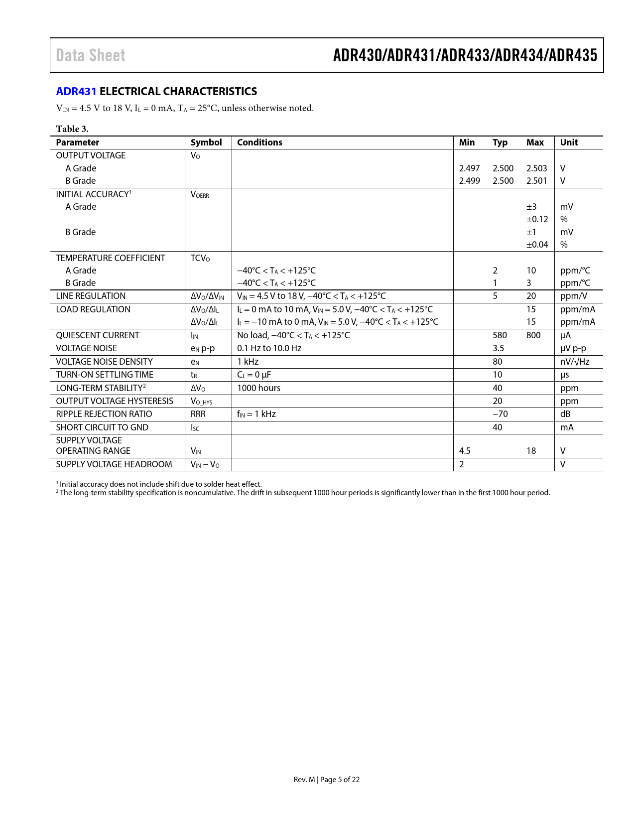 Data Sheet. ADR430/ADR431/ADR433/ADR434/ADR435. ADR431. ELECTRICAL CHARACTERISTICS. Table 3. Parameter. Symbol. Conditions. Min. Typ. Max