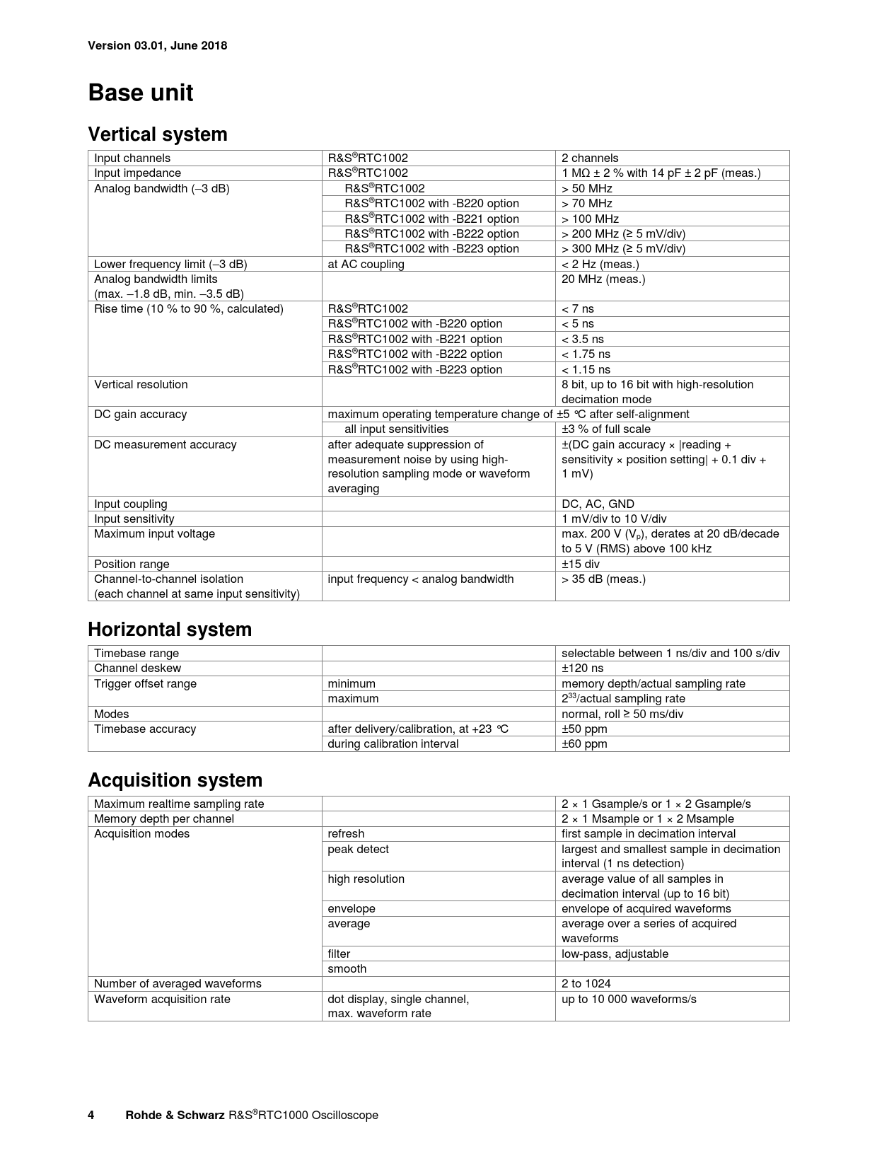 Version 03.01, June 2018Base unitVertical system Input channels R&S®RTC1002 2 channels Input impedance R&S®RTC1002 1 MΩ ± 2 % with 14 pF ± 2 pF (meas.) Analog bandwidth (–3 dB) R&S®RTC1002 > 50 MHz R&S®RTC1002 with -B220 option > 70 MHz R&S®RTC1002 with -B221 option > 100 MHz R&S®RTC1002 with -B222 option > 200 MHz (≥ 5 mV/div) R&S®RTC1002 with -B223 option > 300 MHz (≥ 5 mV/div) Lower frequency limit (–3 dB) at AC coupling < 2 Hz (meas.) Analog bandwidth limits 20 MHz (meas.) (max. –1.8 dB, min. –3.5 dB) Rise time (10 % to 90 %, calculated) R&S®RTC1002 < 7 ns R&S®RTC1002 with -B220 option < 5 ns R&S®RTC1002 with -B221 option < 3.5 ns R&S®RTC1002 with -B222 option < 1.75 ns R&S®RTC1002 with -B223 option < 1.15 ns Vertical resolution 8 bit, up to 16 bit with high-resolution decimation mode DC gain accuracy maximum operating temperature change of ±5 °C after self-alignment all input sensitivities ±3 % of full scale DC measurement accuracy after adequate suppression of ±(DC gain accuracy × |reading + measurement noise by using high- sensitivity × position setting| + 0.1 div + resolution sampling mode or waveform 1 mV) averaging Input coupling DC, AC, GND Input sensitivity 1 mV/div to 10 V/div Maximum input voltage max. 200 V (Vp), derates at 20 dB/decade to 5 V (RMS) above 100 kHz Position range ±15 div Channel-to-channel isolation input frequency < analog bandwidth > 35 dB (meas.) (each channel at same input sensitivity) Horizontal system Timebase range selectable between 1 ns/div and 100 s/div Channel deskew ±120 ns Trigger offset range minimum memory depth/actual sampling rate maximum 233/actual sampling rate Modes normal, roll ≥ 50 ms/div Timebase accuracy after delivery/calibration, at +23 °C ±50 ppm during calibration interval ±60 ppm Acquisition system Maximum realtime sampling rate 2 × 1 Gsample/s or 1 × 2 Gsample/s Memory depth per channel 2 × 1 Msample or 1 × 2 Msample Acquisition modes refresh first sample in decimation interval peak detect largest and smallest sample in decimation interval (1 ns detection) high resolution average value of all samples in decimation interval (up to 16 bit) envelope envelope of acquired waveforms average average over a series of acquired waveforms filter low-pass, adjustable smooth Number of averaged waveforms 2 to 1024 Waveform acquisition rate dot display, single channel, up to 10 000 waveforms/s max. waveform rate 4Rohde & Schwarz R&S®RTC1000 Oscilloscope