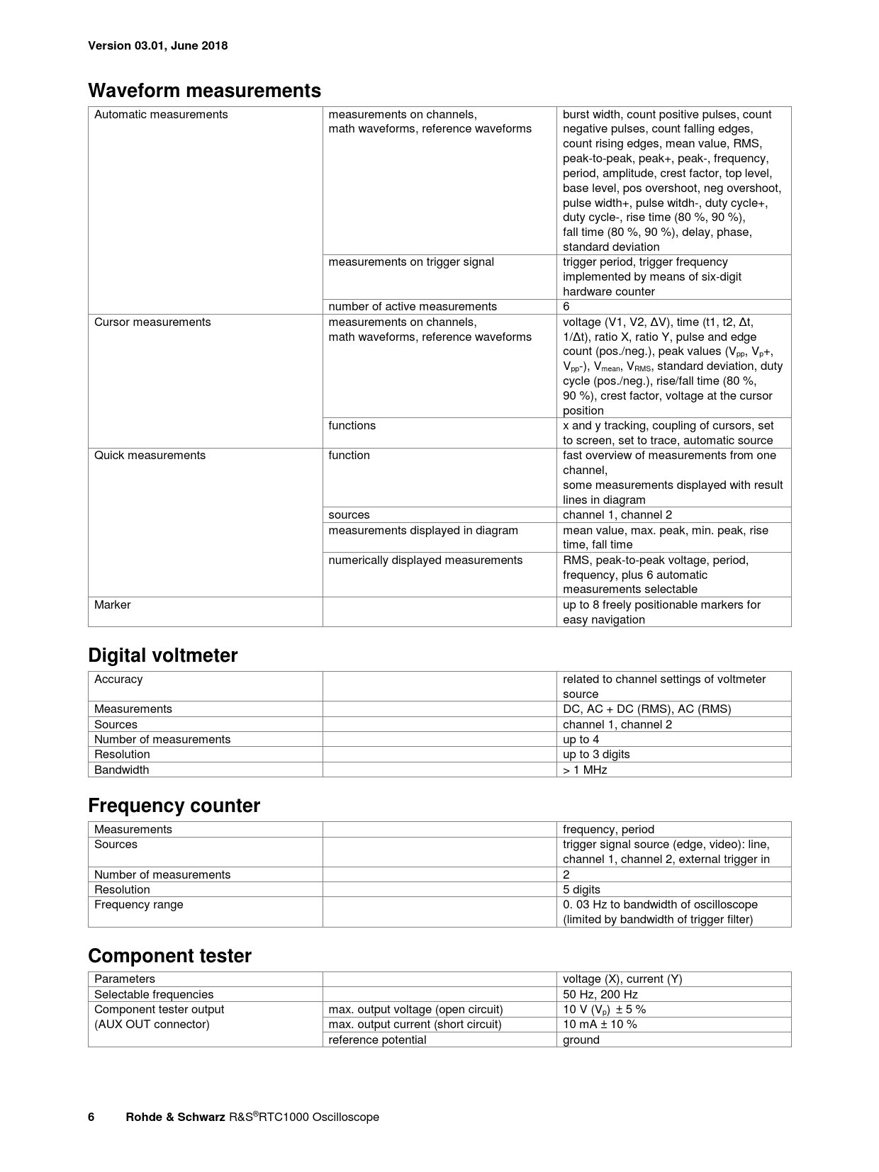 Version 03.01, June 2018Waveform measurements Automatic measurements measurements on channels, burst width, count positive pulses, count math waveforms, reference waveforms negative pulses, count falling edges, count rising edges, mean value, RMS, peak-to-peak, peak+, peak-, frequency, period, amplitude, crest factor, top level, base level, pos overshoot, neg overshoot, pulse width+, pulse witdh-, duty cycle+, duty cycle-, rise time (80 %, 90 %), fall time (80 %, 90 %), delay, phase, standard deviation measurements on trigger signal trigger period, trigger frequency implemented by means of six-digit hardware counter number of active measurements 6 Cursor measurements measurements on channels, voltage (V1, V2, ΔV), time (t1, t2, Δt, math waveforms, reference waveforms 1/Δt), ratio X, ratio Y, pulse and edge count (pos./neg.), peak values (Vpp, Vp+, Vpp-), Vmean, VRMS, standard deviation, duty cycle (pos./neg.), rise/fall time (80 %, 90 %), crest factor, voltage at the cursor position functions x and y tracking, coupling of cursors, set to screen, set to trace, automatic source Quick measurements function fast overview of measurements from one channel, some measurements displayed with result lines in diagram sources channel 1, channel 2 measurements displayed in diagram mean value, max. peak, min. peak, rise time, fall time numerically displayed measurements RMS, peak-to-peak voltage, period, frequency, plus 6 automatic measurements selectable Marker up to 8 freely positionable markers for easy navigation Digital voltmeter Accuracy related to channel settings of voltmeter source Measurements DC, AC + DC (RMS), AC (RMS) Sources channel 1, channel 2 Number of measurements up to 4 Resolution up to 3 digits Bandwidth > 1 MHz Frequency counter Measurements frequency, period Sources trigger signal source (edge, video): line, channel 1, channel 2, external trigger in Number of measurements 2 Resolution 5 digits Frequency range 0. 03 Hz to bandwidth of oscilloscope (limited by bandwidth of trigger filter) Component tester Parameters voltage (X), current (Y) Selectable frequencies 50 Hz, 200 Hz Component tester output max. output voltage (open circuit) 10 V (Vp) ± 5 % (AUX OUT connector) max. output current (short circuit) 10 mA ± 10 % reference potential ground 6Rohde & Schwarz R&S®RTC1000 Oscilloscope