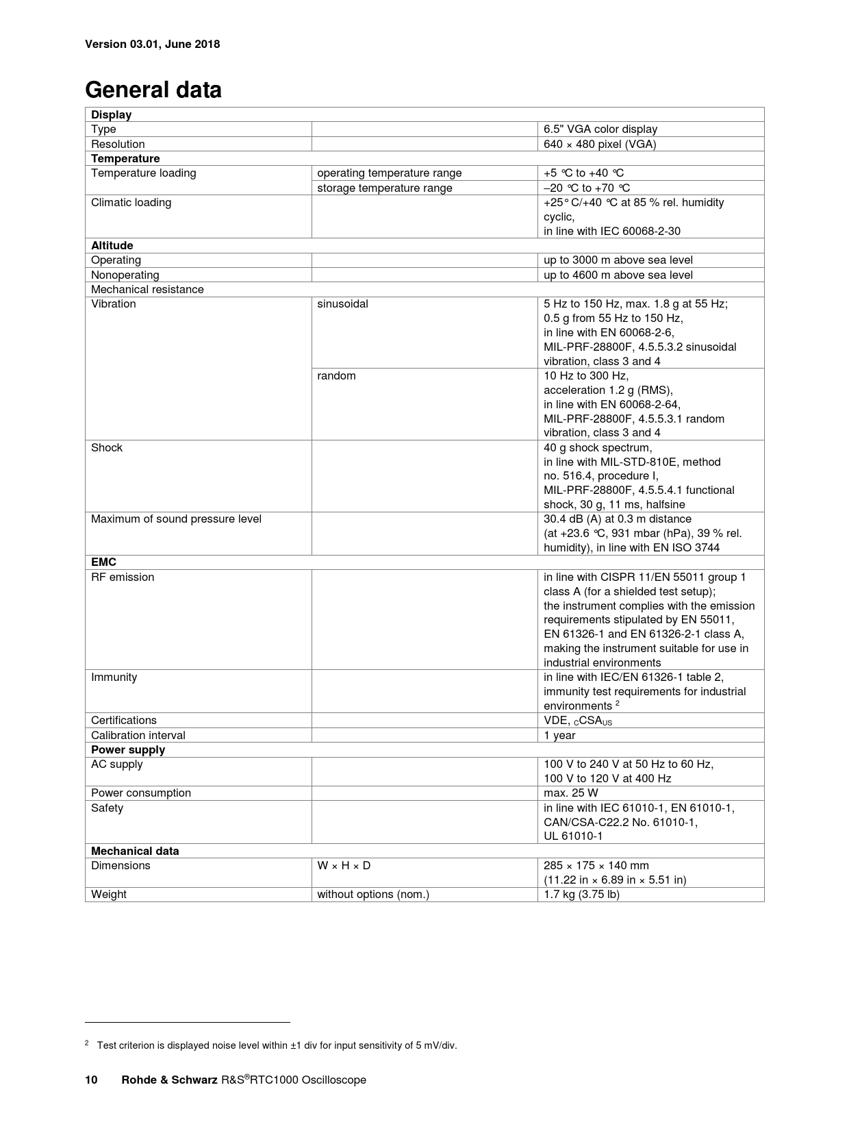 Version 03.01, June 2018General dataDisplay Type 6.5" VGA color display Resolution 640 × 480 pixel (VGA) Temperature Temperature loading operating temperature range +5 °C to +40 °C storage temperature range –20 °C to +70 °C Climatic loading +25° C/+40 °C at 85 % rel. humidity cyclic, in line with IEC 60068-2-30 Altitude Operating up to 3000 m above sea level Nonoperating up to 4600 m above sea level Mechanical resistance Vibration sinusoidal 5 Hz to 150 Hz, max. 1.8 g at 55 Hz; 0.5 g from 55 Hz to 150 Hz, in line with EN 60068-2-6, MIL-PRF-28800F, 4.5.5.3.2 sinusoidal vibration, class 3 and 4 random 10 Hz to 300 Hz, acceleration 1.2 g (RMS), in line with EN 60068-2-64, MIL-PRF-28800F, 4.5.5.3.1 random vibration, class 3 and 4 Shock 40 g shock spectrum, in line with MIL-STD-810E, method no. 516.4, procedure I, MIL-PRF-28800F, 4.5.5.4.1 functional shock, 30 g, 11 ms, halfsine Maximum of sound pressure level 30.4 dB (A) at 0.3 m distance (at +23.6 °C, 931 mbar (hPa), 39 % rel. humidity), in line with EN ISO 3744 EMC RF emission in line with CISPR 11/EN 55011 group 1 class A (for a shielded test setup); the instrument complies with the emission requirements stipulated by EN 55011, EN 61326-1 and EN 61326-2-1 class A, making the instrument suitable for use in industrial environments Immunity in line with IEC/EN 61326-1 table 2, immunity test requirements for industrial environments 2 Certifications VDE, CCSAUS Calibration interval 1 year Power supply AC supply 100 V to 240 V at 50 Hz to 60 Hz, 100 V to 120 V at 400 Hz Power consumption max. 25 W Safety in line with IEC 61010-1, EN 61010-1, CAN/CSA-C22.2 No. 61010-1, UL 61010-1 Mechanical data Dimensions W × H × D 285 × 175 × 140 mm (11.22 in × 6.89 in × 5.51 in) Weight without options (nom.) 1.7 kg (3.75 lb) 2 Test criterion is displayed noise level within ±1 div for input sensitivity of 5 mV/div. 10Rohde & Schwarz R&S®RTC1000 Oscilloscope