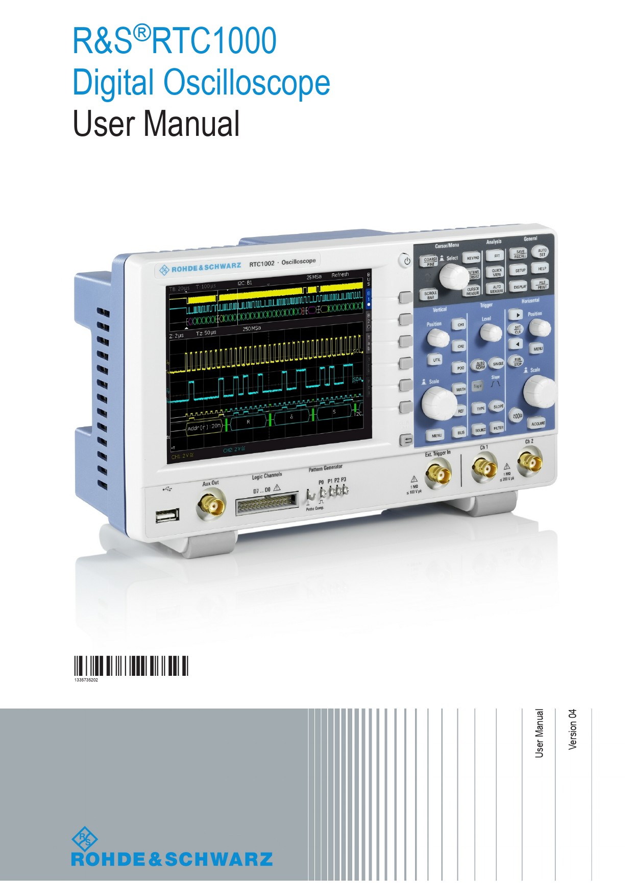 R&S®RTC1000 Digital Oscilloscope User Manual (=S×Â2) 1335735202 Version 04 User Manual Document Outline Cover Contents 1 Preface 1.1 Safety Instructions 1.2 Documentation Overview 1.2.1 Manuals and Instrument Help 1.2.2 Data Sheet and Brochure 1.2.3 Calibration Certificate 1.2.4 Release Notes, Open Source Acknowledgment 2 Getting Started 2.1 Preparing for Use 2.1.1 Unpacking and Checking the Instrument 2.1.2 Positioning the Instrument 2.1.3 Starting the Instrument 2.1.3.1 Powering On 2.1.3.2 Starting Up and Shutting Down 2.1.3.3 Powering Off 2.1.4 Replacing the Fuse 2.2 Instrument Tour 2.2.1 Front Panel 2.2.1.1 Input Connectors 2.2.1.2 Other Connectors on the Front Panel 2.2.2 Rear Panel 3 Operating Basics 3.1 Control Panel 3.1.1 Cursor/Menu Section 3.1.2 Analysis Section 3.1.3 General Section 3.1.4 Vertical Section 3.1.5 Trigger Section 3.1.6 Horizontal Section 3.2 Display 3.3 Operating Concept 3.4 Integrated Help 3.5 Signal Display 3.5.1 Display Settings 3.5.2 Virtual Screen 3.5.3 Signal Intensity and Persistence 3.6 General Instrument Settings 3.7 Self-Alignment 3.8 Firmware Update 3.9 Options 4 Waveform Setup 4.1 Vertical Setup 4.1.1 Vertical Controls 4.1.2 Vertical Settings in the Channel Menus 4.1.3 Probe Compensation 4.2 Horizontal Setup 4.3 Acquisition Setup 4.3.1 RUN/STOP and SINGLE 4.3.2 Acquisition Settings 4.3.3 Record Modes 4.3.3.1 Comparison of Record Modes 4.3.4 Interlace Mode 5 Trigger 5.1 Setting Up the Trigger 5.2 General Trigger Settings 5.3 Edge Trigger 5.4 Pulse Trigger 5.5 Logic Trigger 5.5.1 Logic Pattern 5.5.2 Time Limitation 5.6 Video Trigger 5.7 Trigger Out Pulses 5.8 External Trigger Input 6 Analysis 6.1 Zoom Function 6.2 Marker Function 6.3 XY-Display 6.4 Mathematics 6.4.1 Quick Mathematics (QM) 6.4.2 Advanced Mathematics 6.4.2.1 To Create a Formulary Set and Its Equations 6.4.2.2 To Edit Equations 6.4.2.3 To Save and Load a Formulary Set 6.4.2.4 Example 6.5 Frequency Analysis (FFT) 6.6 Pass/Fail Test Based on Masks 6.7 Component Test 6.7.1 In-circuit Tests 6.8 Digital Voltmeter 7 Measurements 7.1 Quick View 7.2 Cursor Measurements 7.2.1 Cursor Measurement Settings 7.2.2 Measurement Types 7.3 Automatic Measurements 7.3.1 Settings for Automatic Measurements 7.3.2 Automatic Measurement Types 8 Documenting Results 8.1 Saving and Loading Instrument Settings 8.2 Reference Waveforms 8.3 Waveforms (Traces) 8.3.1 Waveform File Formats 8.3.1.1 CSV Format 8.3.1.2 TXT Format 8.3.1.3 BIN Format 8.3.1.4 FLT Format 8.3.1.5 TRF Format 8.4 Screenshots 8.4.1 Saving Screenshots 8.4.2 Printing Screenshots 8.5 Quick Access with FILE/PRINT Key 9 Mixed Signal Operation (Option R&S RTC-B1) 9.1 Using Logic Channels 9.2 Logic Trigger for Digital Input 9.3 Cursor Measurements for Logic Channels 9.4 Automatic Measurements for Logic Channels 9.5 Using Logic Channels in Buses 9.5.1 Parallel / Parallel Clocked Bus 10 Signal Generation (Option R&S RTC-B6) 10.1 Function Generator 10.2 Pattern Generator 10.2.1 Square Wave 10.2.2 Counter 10.2.3 Arbitrary 10.2.4 Manual 10.2.5 Serial Buses 11 Serial Bus Analysis 11.1 Bus Configuration 11.2 Bus Table: Decode Results 11.3 I2C Bus (Option R&S RTC-K1) 11.3.1 I2C Bus Configuration 11.3.2 I2C Bus Triggering 11.3.3 I2C Decode Results 11.4 SPI / SSPI BUS (Option R&S RTC-K1) 11.4.1 SPI / SSPI Bus Configuration 11.4.2 SPI / SSPI Bus Triggering 11.4.3 SPI / SSPI Decode Results 11.5 UART/RS-232 BUS (Option R&S RTC-K2) 11.5.1 UART/RS-232 Bus Configuration 11.5.2 UART/RS-232 BUS Triggering 11.5.3 UART Decode Results 11.6 CAN Bus (Option R&S RTC-K3) 11.6.1 CAN Bus Configuration 11.6.2 CAN Bus Triggering 11.6.3 CAN Decode Results 11.7 LIN Bus (Option R&S RTC-K3) 11.7.1 LIN Bus Configuration 11.7.2 LIN Bus Triggering 11.7.3 LIN Decode Results 12 Network Connections and Remote Operation 12.1 LAN Connection 12.2 Remote Access Using a Web Browser 12.2.1 Accessing the Instrument Using a Web Browser 12.2.2 Instrument Home 12.2.3 Screenshot 12.2.4 SCPI Device Control 12.2.5 Save/Recall 12.2.6 Network Settings 12.3 USB Connection 12.3.1 USB TMC 12.3.2 USB VCP 12.3.3 USM MTP 12.4 Switching to Remote Control 13 Remote Commands Reference 13.1 Conventions Used in Remote Command Description 13.2 Common Commands 13.3 Acquisition and Setup 13.3.1 Starting and Stopping Acquisition 13.3.2 Time Base 13.3.3 Acquisition 13.3.4 Vertical 13.3.5 Waveform Data 13.3.6 Waveform Data Export to File 13.3.7 Logic Channel 13.3.8 Probes 13.4 Trigger 13.4.1 General A Trigger Settings 13.4.2 Edge Trigger 13.4.3 Width (Pulse) Trigger 13.4.4 Video/TV Trigger 13.4.5 Pattern (Logic) Trigger 13.5 Display 13.5.1 Basic Display Settings 13.5.1.1 General Display Settings 13.5.1.2 XY-Setup 13.5.1.3 Intensities 13.5.1.4 Waveform and Grid Settings 13.5.2 Zoom 13.5.3 Markers (Timestamps) 13.6 Measurements 13.6.1 Cursor 13.6.2 Quick View 13.6.3 Automatic Measurements 13.7 Quickmath and Reference Waveforms 13.7.1 Quickmath 13.7.2 Reference Waveforms 13.8 FFT 13.9 Masks 13.10 Function Generator 13.11 Pattern Generator 13.12 Digital Voltmeter 13.13 Counter 13.14 Component Tester 13.15 External input 13.16 Protocol Analysis 13.16.1 General 13.16.2 Parallel / Parallel Clocked Bus 13.16.3 SPI Bus 13.16.3.1 SPI - Configuration 13.16.3.2 Trigger 13.16.3.3 Decode 13.16.4 SSPI Bus 13.16.5 I2C Bus 13.16.5.1 I2C - Configuration 13.16.5.2 Trigger 13.16.5.3 Decode 13.16.6 UART 13.16.6.1 UART - Configuration 13.16.6.2 Trigger 13.16.6.3 Decode 13.16.7 CAN 13.16.7.1 CAN - Configuration 13.16.7.2 Trigger 13.16.7.3 Decode 13.16.8 LIN 13.16.8.1 LIN - Configuration 13.16.8.2 Trigger 13.16.8.3 Decode 13.17 Data and File Management 13.17.1 Output Control 13.17.2 MMEMory Commands 13.18 General Instrument Setup 13.19 Status Reporting 13.19.1 STATus:OPERation Register 13.19.2 STATus:QUEStionable Registers Annex A SCPI Command Structure A.1 Syntax for Common Commands A.2 Syntax for Device-Specific Commands A.2.1 Long and short form A.2.2 Numeric Suffixes A.2.3 Optional Mnemonics A.3 SCPI Parameters A.3.1 Numeric Values A.3.2 Speci