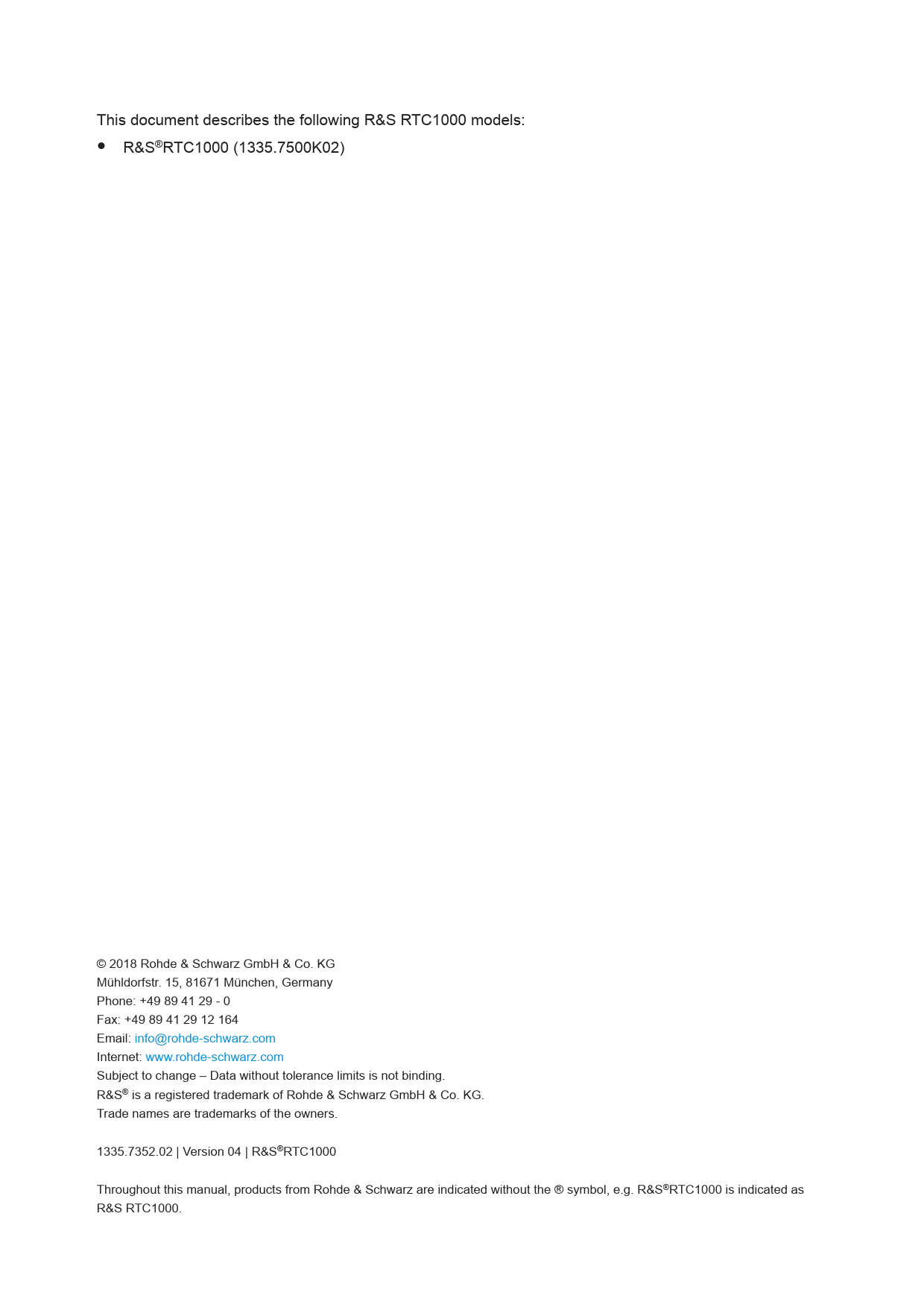This. document. describes. the. following. R&S. RTC1000. models:. ●. R&S®RTC1000. (1335.7500K02). ©. 2018. Rohde. &. Schwarz. GmbH. &. Co. KG