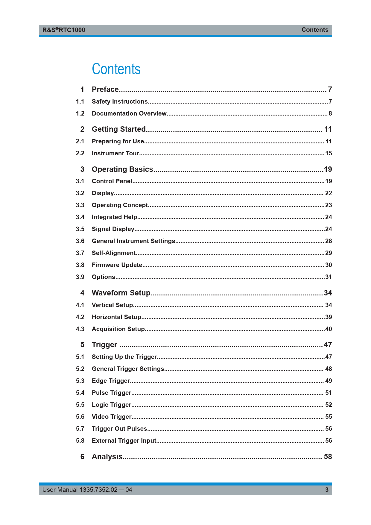 link to page 7 link to page 7 link to page 8 link to page 11 link to page 11 link to page 15 link to page 19 link to page 19 link to page 22 link to page 23 link to page 24 link to page 24 link to page 28 link to page 29 link to page 30 link to page 31 link to page 34 link to page 34 link to page 39 link to page 40 link to page 47 link to page 47 link to page 48 link to page 49 link to page 51 link to page 52 link to page 55 link to page 56 link to page 56 link to page 58 R&S ® RTC1000Contents Contents 1 Preface.. 71.1Safety Instructions..71.2Documentation Overview... 82 Getting Started... 112.1Preparing for Use.. 112.2Instrument Tour...153 Operating Basics..193.1Control Panel...193.2Display... 223.3Operating Concept..233.4Integrated Help.. 243.5Signal Display..243.6General Instrument Settings.. 283.7Self-Alignment...293.8Firmware Update... 303.9Options...314 Waveform Setup...344.1Vertical Setup.. 344.2Horizontal Setup..394.3Acquisition Setup..405 Trigger ..475.1Setting Up the Trigger...475.2General Trigger Settings.. 485.3Edge Trigger.. 495.4Pulse Trigger... 515.5Logic Trigger... 525.6Video Trigger... 555.7Trigger Out Pulses.. 565.8External Trigger Input... 566 Analysis.. 58 User Manual 1335.7352.02 ─ 04 3 Document Outline Cover Contents 1 Preface 1.1 Safety Instructions 1.2 Documentation Overview 1.2.1 Manuals and Instrument Help 1.2.2 Data Sheet and Brochure 1.2.3 Calibration Certificate 1.2.4 Release Notes, Open Source Acknowledgment 2 Getting Started 2.1 Preparing for Use 2.1.1 Unpacking and Checking the Instrument 2.1.2 Positioning the Instrument 2.1.3 Starting the Instrument 2.1.3.1 Powering On 2.1.3.2 Starting Up and Shutting Down 2.1.3.3 Powering Off 2.1.4 Replacing the Fuse 2.2 Instrument Tour 2.2.1 Front Panel 2.2.1.1 Input Connectors 2.2.1.2 Other Connectors on the Front Panel 2.2.2 Rear Panel 3 Operating Basics 3.1 Control Panel 3.1.1 Cursor/Menu Section 3.1.2 Analysis Section 3.1.3 General Section 3.1.4 Vertical Section 3.1.5 Trigger Section 3.1.6 Horizontal Section 3.2 Display 3.3 Operating Concept 3.4 Integrated Help 3.5 Signal Display 3.5.1 Display Settings 3.5.2 Virtual Screen 3.5.3 Signal Intensity and Persistence 3.6 General Instrument Settings 3.7 Self-Alignment 3.8 Firmware Update 3.9 Options 4 Waveform Setup 4.1 Vertical Setup 4.1.1 Vertical Controls 4.1.2 Vertical Settings in the Channel Menus 4.1.3 Probe Compensation 4.2 Horizontal Setup 4.3 Acquisition Setup 4.3.1 RUN/STOP and SINGLE 4.3.2 Acquisition Settings 4.3.3 Record Modes 4.3.3.1 Comparison of Record Modes 4.3.4 Interlace Mode 5 Trigger 5.1 Setting Up the Trigger 5.2 General Trigger Settings 5.3 Edge Trigger 5.4 Pulse Trigger 5.5 Logic Trigger 5.5.1 Logic Pattern 5.5.2 Time Limitation 5.6 Video Trigger 5.7 Trigger Out Pulses 5.8 External Trigger Input 6 Analysis 6.1 Zoom Function 6.2 Marker Function 6.3 XY-Display 6.4 Mathematics 6.4.1 Quick Mathematics (QM) 6.4.2 Advanced Mathematics 6.4.2.1 To Create a Formulary Set and Its Equations 6.4.2.2 To Edit Equations 6.4.2.3 To Save and Load a Formulary Set 6.4.2.4 Example 6.5 Frequency Analysis (FFT) 6.6 Pass/Fail Test Based on Masks 6.7 Component Test 6.7.1 In-circuit Tests 6.8 Digital Voltmeter 7 Measurements 7.1 Quick View 7.2 Cursor Measurements 7.2.1 Cursor Measurement Settings 7.2.2 Measurement Types 7.3 Automatic Measurements 7.3.1 Settings for Automatic Measurements 7.3.2 Automatic Measurement Types 8 Documenting Results 8.1 Saving and Loading Instrument Settings 8.2 Reference Waveforms 8.3 Waveforms (Traces) 8.3.1 Waveform File Formats 8.3.1.1 CSV Format 8.3.1.2 TXT Format 8.3.1.3 BIN Format 8.3.1.4 FLT Format 8.3.1.5 TRF Format 8.4 Screenshots 8.4.1 Saving Screenshots 8.4.2 Printing Screenshots 8.5 Quick Access with FILE/PRINT Key 9 Mixed Signal Operation (Option R&S RTC-B1) 9.1 Using Logic Channels 9.2 Logic Trigger for Digital Input 9.3 Cursor Measurements for Logic Channels 9.4 Automatic Measurements for Logic Channels 9.5 Using Logic Channels in Buses 9.5.1 Parallel / Parallel Clocked Bus 10 Signal Generation (Option R&S RTC-B6) 10.1 Function Generator 10.2 Pattern Generator 10.2.1 Square Wave 10.2.2 Counter 10.2.3 Arbitrary 10.2.4 Manual 10.2.5 Serial Buses 11 Serial Bus Analysis 11.1 Bus Configuration 11.2 Bus Table: Decode Results 11.3 I2C Bus (Option R&S RTC-K1) 11.3.1 I2C Bus Configuration 11.3.2 I2C Bus Triggering 11.3.3 I2C Decode Results 11.4 SPI / SSPI BUS (Option R&S RTC-K1) 11.4.1 SPI / SSPI Bus Configuration 11.4.2 SPI / SSPI Bus Triggering 11.4.3 SPI / SSPI Decode Results 11.5 UART/RS-232 BUS (Option R&S RTC-K2) 11.5.1 UART/RS-232 Bus Configuration 11.5.2 UART/RS-232 BUS Triggering 11.5.3 UART Decode Results 11.6 CAN Bus (Option R&S RTC-K3) 11.6.1 CAN Bus Configuration 11.6.2 CAN Bus Triggering 11.6.3 CAN Decode Results 11.7 LIN Bus (Option R&S RTC-K3) 11.7.1 LIN Bus Configuration 11.7.2 LIN Bus Triggering 11.7.3 LIN Decode Results 12 Network Connections and Remote Operation 12.1 LAN Connection 12.2 Remote Access Using a Web Browser 12.2.1 Accessing the Instrument Using a Web Browser 12.2.2 Instrument Home 12.2.3 Screenshot 12.2.4 SCPI Device Control 12.2.5 Save/Recall 12.2.6 Network Settings 12.3 USB Connection 12.3.1 USB TMC 12.3.2 USB VCP 12.3.3 USM MTP 12.4 Switching to Remote Control 13 Remote Commands Reference 13.1 Conventions Used in Remote Command Description 13.2 Common Commands 13.3 Acquisition and Setup 13.3.1 Starting and Stopping Acquisition 13.3.2 Time Base 13.3.3 Acquisition 13.3.4 Vertical 13.3.5 Waveform Data 13.3.6 Waveform Data Export to File 13.3.7 Logic Channel 13.3.8 Probes 13.4 Trigger 13.4.1 General A Trigger Settings 13.4.2 Edge Trigger 13.4.3 Width (Pulse) Trigger 13.4.4 Video/TV Trigger 13.4.5 Pattern (Logic) Trigger 13.5 Display 13.5.1 Basic Display Settings 13.5.1.1 General Display Settings 13.5.1.2 XY-Setup 13.5.1.3 Intensities 13.5.1.4 Waveform and Grid Settings 13.5.2 Zoom 13.5.3 Markers (Timestamps) 13.6 Measurements 13.6.1 Cursor 13.6.2 Quick View 13.6.3 Automatic Measurements 13.7 Quickmath and 