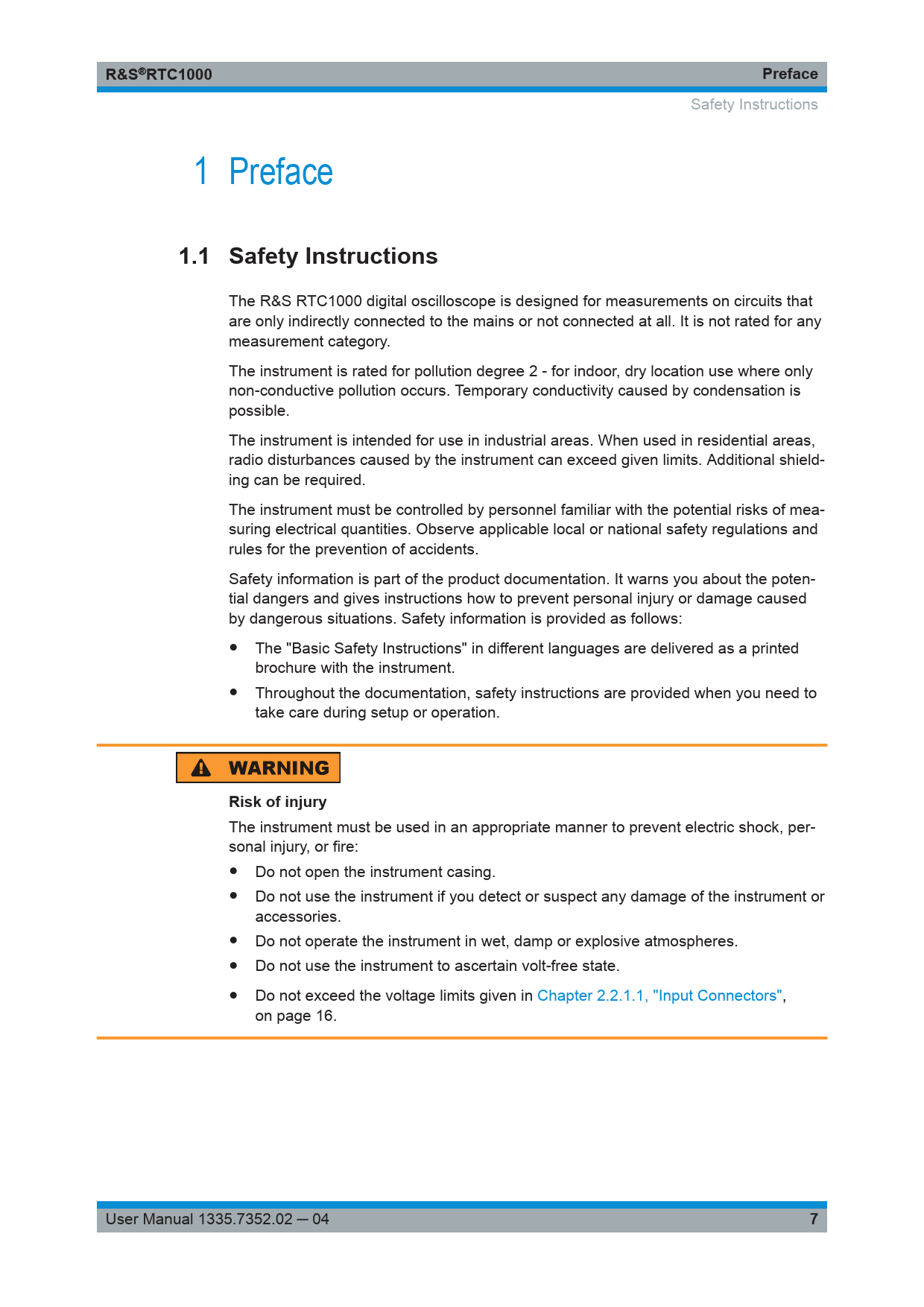 link to page 16 link to page 16 R&S ® RTC1000Preface Safety Instructions 1 Preface 1.1 Safety Instructions The R&S RTC1000 digital oscilloscope is designed for measurements on circuits that are only indirectly connected to the mains or not connected at all. It is not rated for any measurement category. The instrument is rated for pollution degree 2 - for indoor, dry location use where only non-conductive pollution occurs. Temporary conductivity caused by condensation is possible. The instrument is intended for use in industrial areas. When used in residential areas, radio disturbances caused by the instrument can exceed given limits. Additional shield- ing can be required. The instrument must be controlled by personnel familiar with the potential risks of mea- suring electrical quantities. Observe applicable local or national safety regulations and rules for the prevention of accidents. Safety information is part of the product documentation. It warns you about the poten- tial dangers and gives instructions how to prevent personal injury or damage caused by dangerous situations. Safety information is provided as follows: ● The "Basic Safety Instructions" in different languages are delivered as a printed brochure with the instrument. ● Throughout the documentation, safety instructions are provided when you need to take care during setup or operation. Risk of injury The instrument must be used in an appropriate manner to prevent electric shock, per- sonal injury, or fire: ● Do not open the instrument casing. ● Do not use the instrument if you detect or suspect any damage of the instrument or accessories. ● Do not operate the instrument in wet, damp or explosive atmospheres. ● Do not use the instrument to ascertain volt-free state. ● Do not exceed the voltage limits given in Chapter 2.2.1.1, "Input Connectors", on page 16. User Manual 1335.7352.02 ─ 04 7 Document Outline Cover Contents 1 Preface 1.1 Safety Instructions 1.2 Documentation Overview 1.2.1 Manuals and Instrument Help 1.2.2 Data Sheet and Brochure 1.2.3 Calibration Certificate 1.2.4 Release Notes, Open Source Acknowledgment 2 Getting Started 2.1 Preparing for Use 2.1.1 Unpacking and Checking the Instrument 2.1.2 Positioning the Instrument 2.1.3 Starting the Instrument 2.1.3.1 Powering On 2.1.3.2 Starting Up and Shutting Down 2.1.3.3 Powering Off 2.1.4 Replacing the Fuse 2.2 Instrument Tour 2.2.1 Front Panel 2.2.1.1 Input Connectors 2.2.1.2 Other Connectors on the Front Panel 2.2.2 Rear Panel 3 Operating Basics 3.1 Control Panel 3.1.1 Cursor/Menu Section 3.1.2 Analysis Section 3.1.3 General Section 3.1.4 Vertical Section 3.1.5 Trigger Section 3.1.6 Horizontal Section 3.2 Display 3.3 Operating Concept 3.4 Integrated Help 3.5 Signal Display 3.5.1 Display Settings 3.5.2 Virtual Screen 3.5.3 Signal Intensity and Persistence 3.6 General Instrument Settings 3.7 Self-Alignment 3.8 Firmware Update 3.9 Options 4 Waveform Setup 4.1 Vertical Setup 4.1.1 Vertical Controls 4.1.2 Vertical Settings in the Channel Menus 4.1.3 Probe Compensation 4.2 Horizontal Setup 4.3 Acquisition Setup 4.3.1 RUN/STOP and SINGLE 4.3.2 Acquisition Settings 4.3.3 Record Modes 4.3.3.1 Comparison of Record Modes 4.3.4 Interlace Mode 5 Trigger 5.1 Setting Up the Trigger 5.2 General Trigger Settings 5.3 Edge Trigger 5.4 Pulse Trigger 5.5 Logic Trigger 5.5.1 Logic Pattern 5.5.2 Time Limitation 5.6 Video Trigger 5.7 Trigger Out Pulses 5.8 External Trigger Input 6 Analysis 6.1 Zoom Function 6.2 Marker Function 6.3 XY-Display 6.4 Mathematics 6.4.1 Quick Mathematics (QM) 6.4.2 Advanced Mathematics 6.4.2.1 To Create a Formulary Set and Its Equations 6.4.2.2 To Edit Equations 6.4.2.3 To Save and Load a Formulary Set 6.4.2.4 Example 6.5 Frequency Analysis (FFT) 6.6 Pass/Fail Test Based on Masks 6.7 Component Test 6.7.1 In-circuit Tests 6.8 Digital Voltmeter 7 Measurements 7.1 Quick View 7.2 Cursor Measurements 7.2.1 Cursor Measurement Settings 7.2.2 Measurement Types 7.3 Automatic Measurements 7.3.1 Settings for Automatic Measurements 7.3.2 Automatic Measurement Types 8 Documenting Results 8.1 Saving and Loading Instrument Settings 8.2 Reference Waveforms 8.3 Waveforms (Traces) 8.3.1 Waveform File Formats 8.3.1.1 CSV Format 8.3.1.2 TXT Format 8.3.1.3 BIN Format 8.3.1.4 FLT Format 8.3.1.5 TRF Format 8.4 Screenshots 8.4.1 Saving Screenshots 8.4.2 Printing Screenshots 8.5 Quick Access with FILE/PRINT Key 9 Mixed Signal Operation (Option R&S RTC-B1) 9.1 Using Logic Channels 9.2 Logic Trigger for Digital Input 9.3 Cursor Measurements for Logic Channels 9.4 Automatic Measurements for Logic Channels 9.5 Using Logic Channels in Buses 9.5.1 Parallel / Parallel Clocked Bus 10 Signal Generation (Option R&S RTC-B6) 10.1 Function Generator 10.2 Pattern Generator 10.2.1 Square Wave 10.2.2 Counter 10.2.3 Arbitrary 10.2.4 Manual 10.2.5 Serial Buses 11 Serial Bus Analysis 11.1 Bus Configuration 11.2 Bus Table: Decode Results 11.3 I2C Bus (Option R&S RTC-K1) 11.3.1 I2C Bus Configuration 11.3.2 I2C Bus Triggering 11.3.3 I2C Decode Results 11.4 SPI / SSPI BUS (Option R&S RTC-K1) 11.4.1 SPI / SSPI Bus Configuration 11.4.2 SPI / SSPI Bus Triggering 11.4.3 SPI / SSPI Decode Results 11.5 UART/RS-232 BUS (Option R&S RTC-K2) 11.5.1 UART/RS-232 Bus Configuration 11.5.2 UART/RS-232 BUS Triggering 11.5.3 UART Decode Results 11.6 CAN Bus (Option R&S RTC-K3) 11.6.1 CAN Bus Configuration 11.6.2 CAN Bus Triggering 11.6.3 CAN Decode Results 11.7 LIN Bus (Option R&S RTC-K3) 11.7.1 LIN Bus Configuration 11.7.2 LIN Bus Triggering 11.7.3 LIN Decode Results 12 Network Connections and Remote Operation 12.1 LAN Connection 12.2 Remote Access Using a Web Browser 12.2.1 Accessing the Instrument Using a Web Browser 12.2.2 Instrument Home 12.2.3 Screenshot 12.2.4 SCPI Device Control 12.2.5 Save/Recall 12.2.6 Network Settings 12.3 USB Connection 12.3.1 USB TMC 12.3.2 USB VCP 12.3.3 USM MTP 12.4 Switching to Remote Control 13 Remote Commands Reference 13.1 Conventions Used in Remote Command Description 13.2