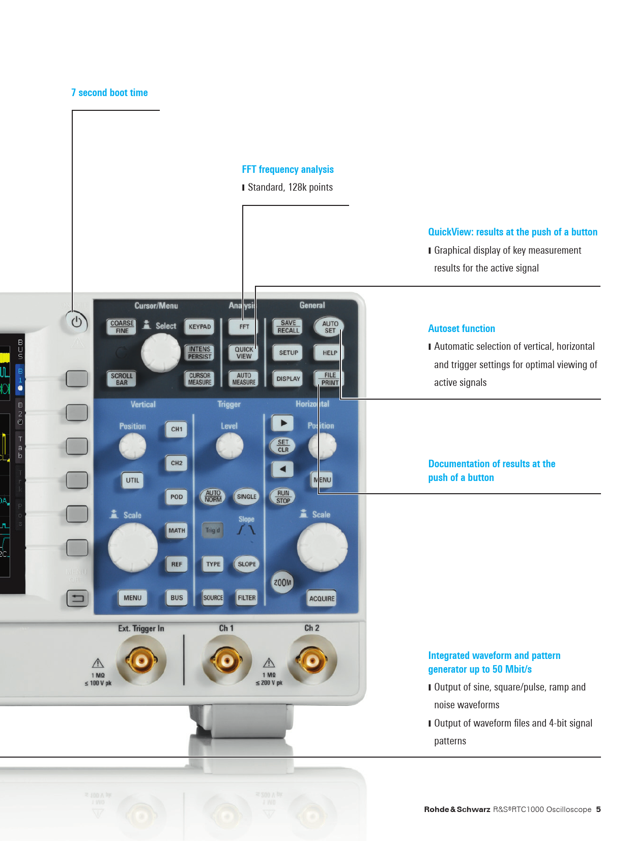 7 second boot timeFFT frequency analysis ❙Standard, 128k points QuickView: results at the push of a button ❙Graphical display of key measurement results for the active signal Autoset function ❙Automatic selection of vertical, horizontal and trigger settings for optimal viewing of active signals Documentation of results at the push of a buttonIntegrated waveform and pattern generator up to 50 Mbit/s ❙Output of sine, square/pulse, ramp and noise waveforms ❙Output of waveform files and 4-bit signal patterns Rohde & Schwarz R&S®RTC1000 Oscilloscope 5 RTC1000_bro_en_3607-4287-12_v0400.indd 5 10.01.2018 12:25:18