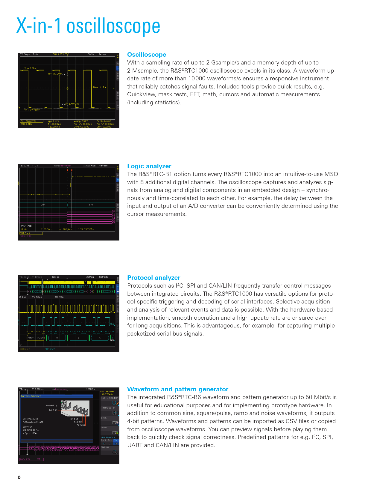 X-in-1 oscilloscope Oscilloscope With a sampling rate of up to 2 Gsample/s and a memory depth of up to 2 Msample, the R&S®RTC1000 oscilloscope excels in its class. A waveform up- date rate of more than 10 000 waveforms/s ensures a responsive instrument that reliably catches signal faults. Included tools provide quick results, e.g. QuickView, mask tests, FFT, math, cursors and automatic measurements (including statistics). Logic analyzer The R&S®RTC-B1 option turns every R&S®RTC1000 into an intuitive-to-use MSO with 8 additional digital channels. The oscilloscope captures and analyzes sig- nals from analog and digital components in an embedded design – synchro- nously and time-correlated to each other. For example, the delay between the input and output of an A/D converter can be conveniently determined using the cursor measurements. Protocol analyzer Protocols such as I2C, SPI and CAN/LIN frequently transfer control messages between integrated circuits. The R&S®RTC1000 has versatile options for proto- col-specific triggering and decoding of serial interfaces. Selective acquisition and analysis of relevant events and data is possible. With the hardware-based implementation, smooth operation and a high update rate are ensured even for long acquisitions. This is advantageous, for example, for capturing multiple packetized serial bus signals. Waveform and pattern generator The integrated R&S®RTC-B6 waveform and pattern generator up to 50 Mbit/s is useful for educational purposes and for implementing prototype hardware. In addition to common sine, square/pulse, ramp and noise waveforms, it outputs 4-bit patterns. Waveforms and patterns can be imported as CSV files or copied from oscilloscope waveforms. You can preview signals before playing them back to quickly check signal correctness. Predefined patterns for e.g. I2C, SPI, UART and CAN/LIN are provided. 6 RTC1000_bro_en_3607-4287-12_v0400.indd 6 10.01.2018 12:25:18