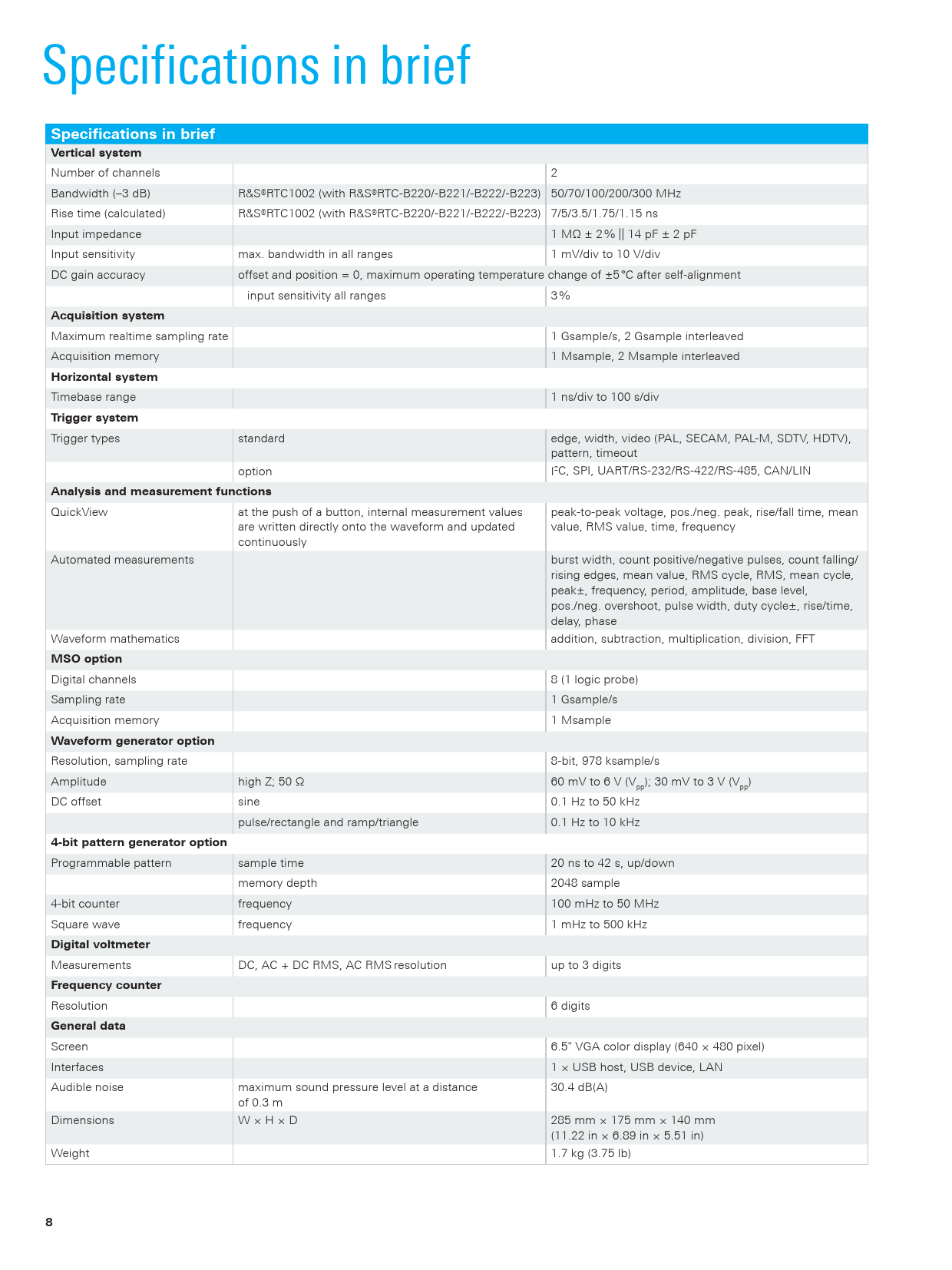 Specifications in brief Specifications in brief Vertical system Number of channels 2 Bandwidth (–3 dB) R&S®RTC1002 (with R&S®RTC-B220/-B221/-B222/-B223) 50/70/100/200/300 MHz Rise time (calculated) R&S®RTC1002 (with R&S®RTC-B220/-B221/-B222/-B223) 7/5/3.5/1.75/1.15 ns Input impedance 1 MΩ ± 2 % || 14 pF ± 2 pF Input sensitivity max. bandwidth in all ranges 1 mV/div to 10 V/div DC gain accuracy offset and position = 0, maximum operating temperature change of ±5 °C after self-alignment input sensitivity all ranges 3 % Acquisition system Maximum realtime sampling rate 1 Gsample/s, 2 Gsample interleaved Acquisition memory 1 Msample, 2 Msample interleaved Horizontal system Timebase range 1 ns/div to 100 s/div Trigger system Trigger types standard edge, width, video (PAL, SECAM, PAL-M, SDTV, HDTV), pattern, timeout option I2C, SPI, UART/RS-232/RS-422/RS-485, CAN/LIN Analysis and measurement functions QuickView at the push of a button, internal measurement values peak-to-peak voltage, pos./neg. peak, rise/fall time, mean are written directly onto the waveform and updated value, RMS value, time, frequency continuously Automated measurements burst width, count positive/negative pulses, count falling/ rising edges, mean value, RMS cycle, RMS, mean cycle, peak±, frequency, period, amplitude, base level, pos./neg. overshoot, pulse width, duty cycle±, rise/time, delay, phase Waveform mathematics addition, subtraction, multiplication, division, FFT MSO option Digital channels 8 (1 logic probe) Sampling rate 1 Gsample/s Acquisition memory 1 Msample Waveform generator option Resolution, sampling rate 8-bit, 978 ksample/s Amplitude high Z; 50 Ω 60 mV to 6 V (V ); 30 mV to 3 V (V ) pp pp DC offset sine 0.1 Hz to 50 kHz pulse/rectangle and ramp/triangle 0.1 Hz to 10 kHz 4-bit pattern generator option Programmable pattern sample time 20 ns to 42 s, up/down memory depth 2048 sample 4-bit counter frequency 100 mHz to 50 MHz Square wave frequency 1 mHz to 500 kHz Digital voltmeter Measurements DC, AC + DC RMS, AC RMS resolution up to 3 digits Frequency counter Resolution 6 digits General data Screen 6.5" VGA color display (640 × 480 pixel) Interfaces 1 × USB host, USB device, LAN Audible noise maximum sound pressure level at a distance 30.4 dB(A) of 0.3 m Dimensions W × H × D 285 mm × 175 mm × 140 mm (11.22 in × 6.89 in × 5.51 in) Weight 1.7 kg (3.75 lb) 8 RTC1000_bro_en_3607-4287-12_v0400.indd 8 10.01.2018 12:25:18