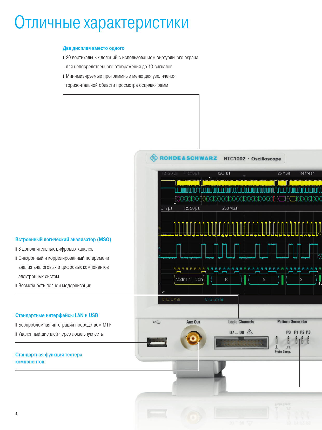 Отличные характеристики Два дисплея вместо одного ❙20 вертикальных делений с использованием виртуального экрана для непосредственного отображения до 13 сигналов ❙Минимизируемые программные меню для увеличения горизонтальной области просмотра осциллограмм Встроенный логический анализатор (MSO) ❙8 дополнительных цифровых каналов ❙Синхронный и коррелированный по времени анализ аналоговых и цифровых компонентов электронных систем ❙Возможность полной модернизации Стандартные интерфейсы LAN и USB ❙Беспроблемная интеграция посредством MTP ❙Удаленный дисплей через локальную сеть Стандартная функция тестера компонентов 4 RTC1000_bro_ru_3607-4287-18_v0302.indd 4 09.01.2018 12:58:08