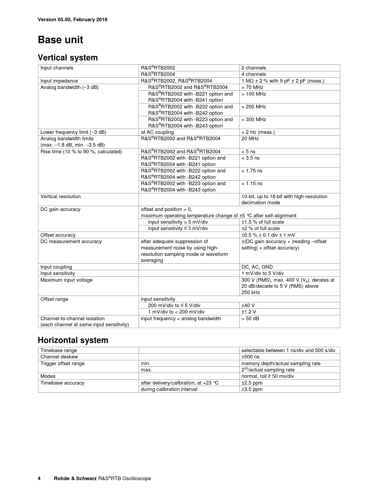 Version 05.00, February 2018Base unitVertical system Input channels R&S®RTB2002 2 channels R&S®RTB2004 4 channels Input impedance R&S®RTB2002, R&S®RTB2004 1 MΩ ± 2 % with 9 pF ± 2 pF (meas.) Analog bandwidth (–3 dB) R&S®RTB2002 and R&S®RTB2004 > 70 MHz R&S®RTB2002 with -B221 option and > 100 MHz R&S®RTB2004 with -B241 option R&S®RTB2002 with -B222 option and > 200 MHz R&S®RTB2004 with -B242 option R&S®RTB2002 with -B223 option and > 300 MHz R&S®RTB2004 with -B243 option Lower frequency limit (–3 dB) at AC coupling < 2 Hz (meas.) Analog bandwidth limits R&S®RTB2002 and R&S®RTB2004 20 MHz (max. –1.8 dB, min. –3.5 dB) Rise time (10 % to 90 %, calculated) R&S®RTB2002 and R&S®RTB2004 < 5 ns R&S®RTB2002 with -B221 option and < 3.5 ns R&S®RTB2004 with -B241 option R&S®RTB2002 with -B222 option and < 1.75 ns R&S®RTB2004 with -B242 option R&S®RTB2002 with -B223 option and < 1.15 ns R&S®RTB2004 with -B243 option Vertical resolution 10-bit, up to 16-bit with high-resolution decimation mode DC gain accuracy offset and position = 0, maximum operating temperature change of ±5 °C after self-alignment input sensitivity > 5 mV/div ±1.5 % of full scale input sensitivity ≤ 5 mV/div ±2 % of full scale Offset accuracy ±0.5 % ± 0.1 div ± 1 mV DC measurement accuracy after adequate suppression of ±(DC gain accuracy × |reading –offset measurement noise by using high- setting| + offset accuracy) resolution sampling mode or waveform averaging Input coupling DC, AC, GND Input sensitivity 1 mV/div to 5 V/div Maximum input voltage 300 V (RMS), max. 400 V (Vp), derates at 20 dB/decade to 5 V (RMS) above 250 kHz Offset range input sensitivity 200 mV/div to ≤ 5 V/div ±40 V 1 mV/div to < 200 mV/div ±1.2 V Channel-to-channel isolation input frequency < analog bandwidth > 50 dB (each channel at same input sensitivity) Horizontal system Timebase range selectable between 1 ns/div and 500 s/div Channel deskew ±500 ns Trigger offset range min. memory depth/actual sampling rate max. 233/actual sampling rate Modes normal, roll ≥ 50 ms/div Timebase accuracy after delivery/calibration, at +23 °C ±2.5 ppm during calibration interval ±3.5 ppm 4Rohde & Schwarz R&S®RTB Oscilloscope