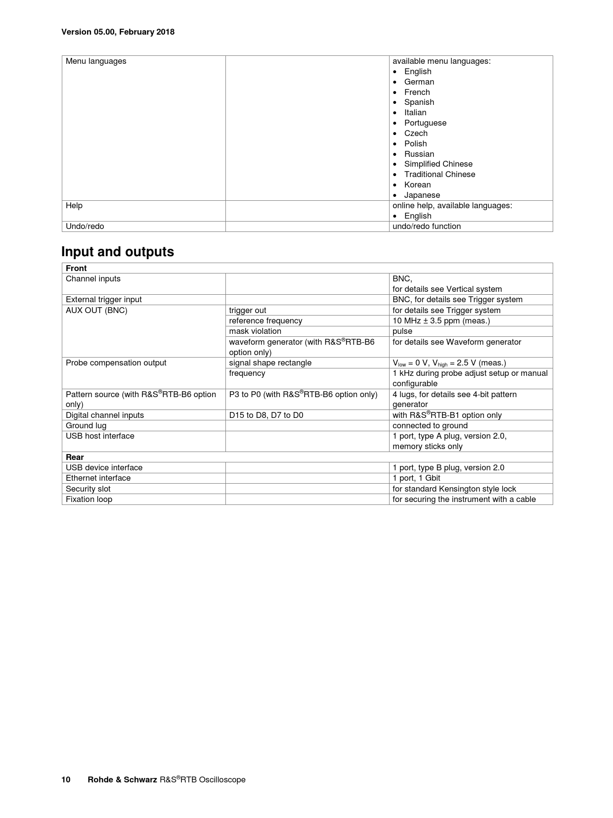 Version 05.00, February 2018 Menu languages available menu languages: English German French Spanish Italian Portuguese Czech Polish Russian Simplified Chinese Traditional Chinese Korean Japanese Help online help, available languages: English Undo/redo undo/redo function Input and outputsFront Channel inputs BNC, for details see Vertical system External trigger input BNC, for details see Trigger system AUX OUT (BNC) trigger out for details see Trigger system reference frequency 10 MHz ± 3.5 ppm (meas.) mask violation pulse waveform generator (with R&S®RTB-B6 for details see Waveform generator option only) Probe compensation output signal shape rectangle Vlow = 0 V, Vhigh = 2.5 V (meas.) frequency 1 kHz during probe adjust setup or manual configurable Pattern source (with R&S®RTB-B6 option P3 to P0 (with R&S®RTB-B6 option only) 4 lugs, for details see 4-bit pattern only) generator Digital channel inputs D15 to D8, D7 to D0 with R&S®RTB-B1 option only Ground lug connected to ground USB host interface 1 port, type A plug, version 2.0, memory sticks only Rear USB device interface 1 port, type B plug, version 2.0 Ethernet interface 1 port, 1 Gbit Security slot for standard Kensington style lock Fixation loop for securing the instrument with a cable 10Rohde & Schwarz R&S®RTB Oscilloscope