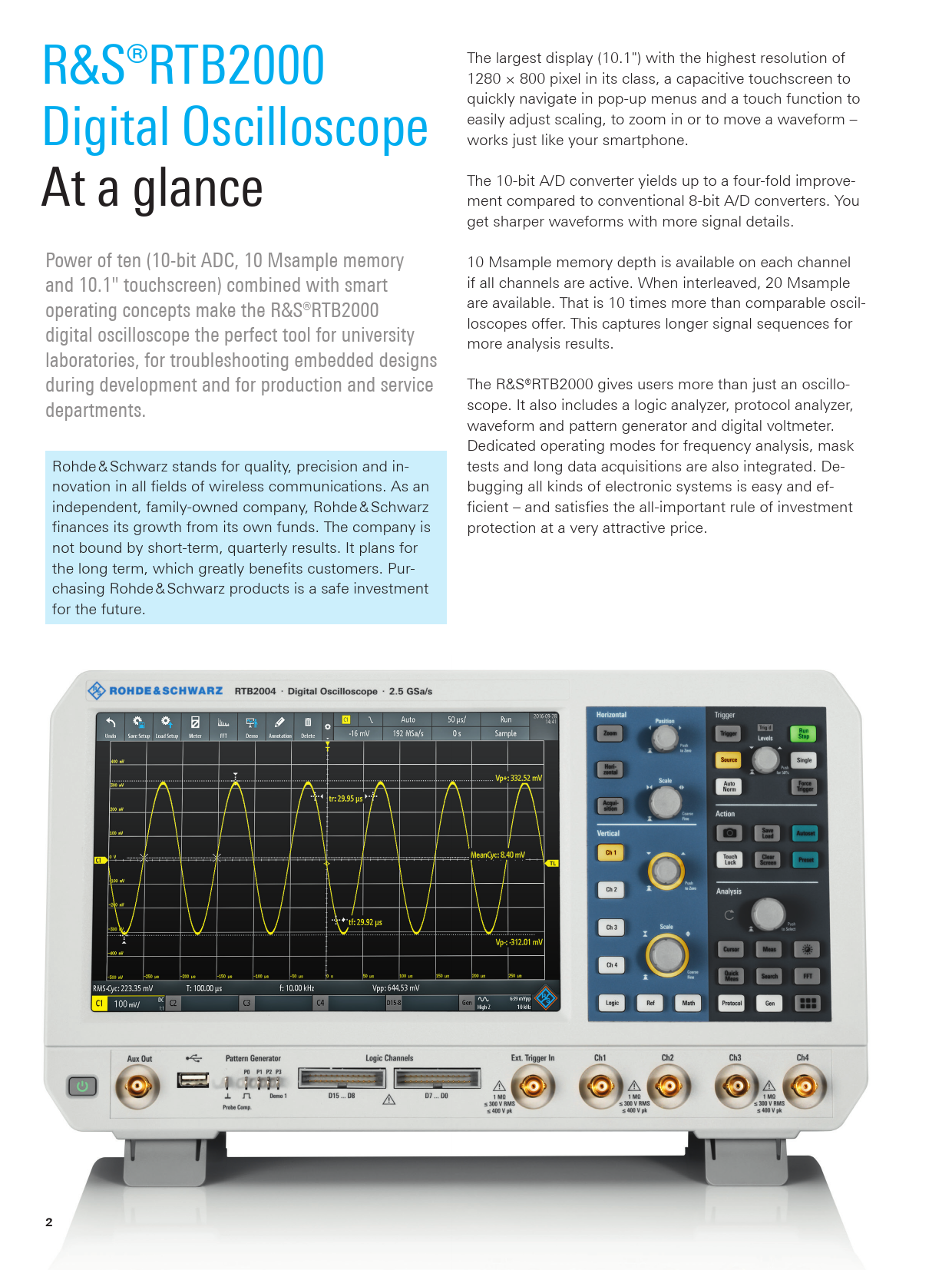 R&S®RTB2000 The largest display (10.1") with the highest resolution of 1280 × 800 pixel in its class, a capacitive touchscreen to Digital Oscilloscope quickly navigate in pop-up menus and a touch function to easily adjust scaling, to zoom in or to move a waveform – works just like your smartphone. At a glance The 10-bit A/D converter yields up to a four-fold improve- ment compared to conventional 8-bit A/D converters. You get sharper waveforms with more signal details. Power of ten (10-bit ADC, 10 Msample memory 10 Msample memory depth is available on each channel and 10.1" touchscreen) combined with smart if all channels are active. When interleaved, 20 Msample operating concepts make the R&S®RTB2000 are available. That is 10 times more than comparable oscil- digital oscilloscope the perfect tool for university loscopes offer. This captures longer signal sequences for more analysis results. laboratories, for troubleshooting embedded designs during development and for production and service The R&S®RTB2000 gives users more than just an oscillo- departments. scope. It also includes a logic analyzer, protocol analyzer, waveform and pattern generator and digital voltmeter. Dedicated operating modes for frequency analysis, mask Rohde & Schwarz stands for quality, precision and in- tests and long data acquisitions are also integrated. De- novation in all fields of wireless communications. As an bugging all kinds of electronic systems is easy and ef- independent, family-owned company, Rohde & Schwarz ficient – and satisfies the all-important rule of investment finances its growth from its own funds. The company is protection at a very attractive price. not bound by short-term, quarterly results. It plans for the long term, which greatly benefits customers. Pur- chasing Rohde & Schwarz products is a safe investment for the future. 2 RTB2000_bro_en_3607-4270-12_v0400.indd 2 07.06.2017 15:53:11