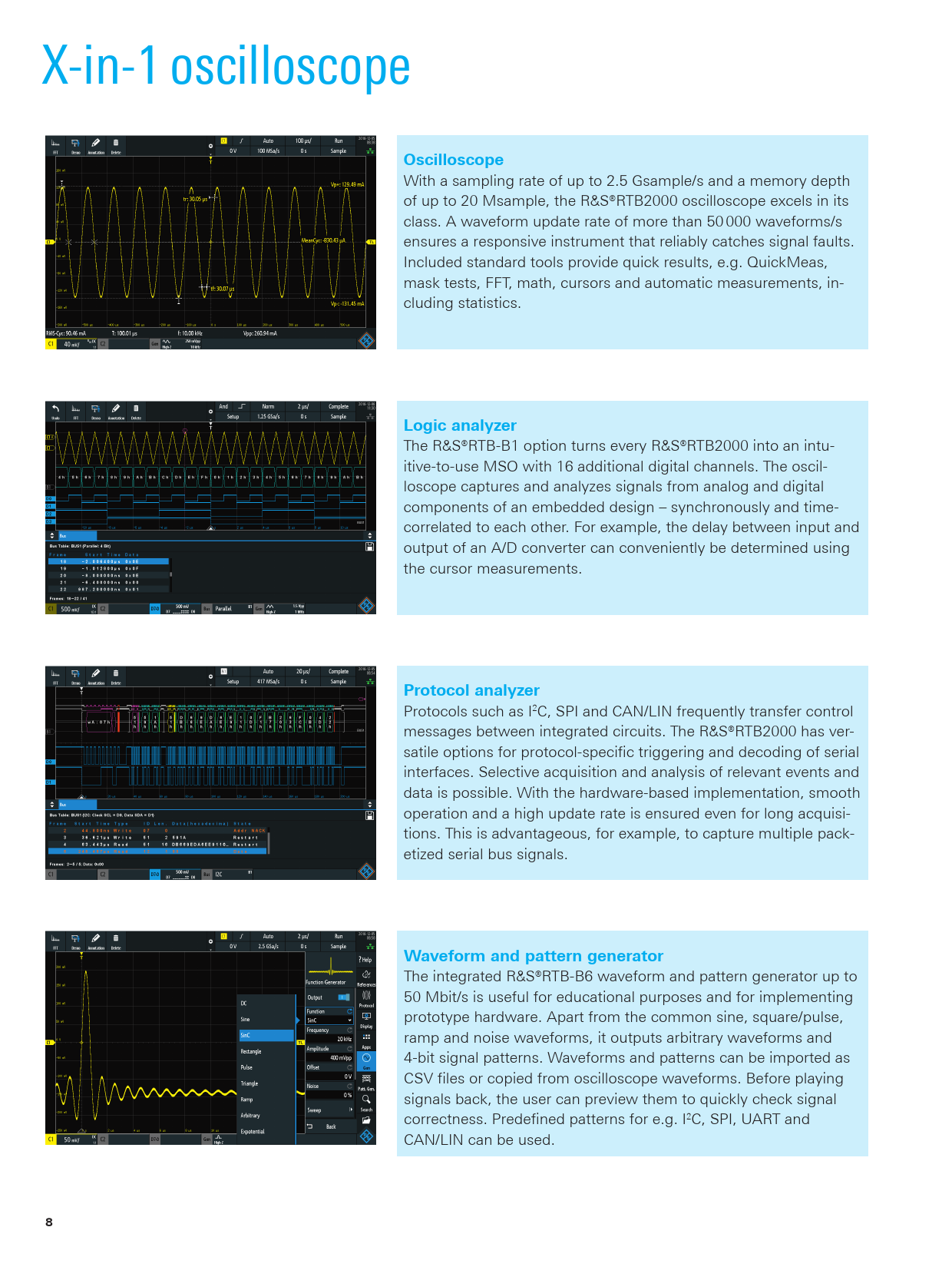 X-in-1 oscilloscope Oscilloscope With a sampling rate of up to 2.5 Gsample/s and a memory depth of up to 20 Msample, the R&S®RTB2000 oscilloscope excels in its class. A waveform update rate of more than 50 000 waveforms/s ensures a responsive instrument that reliably catches signal faults. Included standard tools provide quick results, e.g. QuickMeas, mask tests, FFT, math, cursors and automatic measurements, in- cluding statistics. Logic analyzer The R&S®RTB-B1 option turns every R&S®RTB2000 into an intu- itive-to-use MSO with 16 additional digital channels. The oscil- loscope captures and analyzes signals from analog and digital components of an embedded design – synchronously and time- correlated to each other. For example, the delay between input and output of an A/D converter can conveniently be determined using the cursor measurements. Protocol analyzer Protocols such as I2C, SPI and CAN/LIN frequently transfer control messages between integrated circuits. The R&S®RTB2000 has ver- satile options for protocol-specific triggering and decoding of serial interfaces. Selective acquisition and analysis of relevant events and data is possible. With the hardware-based implementation, smooth operation and a high update rate is ensured even for long acquisi- tions. This is advantageous, for example, to capture multiple pack- etized serial bus signals. Waveform and pattern generator The integrated R&S®RTB-B6 waveform and pattern generator up to 50 Mbit/s is useful for educational purposes and for implementing prototype hardware. Apart from the common sine, square/pulse, ramp and noise waveforms, it outputs arbitrary waveforms and 4-bit signal patterns. Waveforms and patterns can be imported as CSV files or copied from oscilloscope waveforms. Before playing signals back, the user can preview them to quickly check signal correctness. Predefined patterns for e.g. I2C, SPI, UART and CAN/LIN can be used. 8 RTB2000_bro_en_3607-4270-12_v0400.indd 8 07.06.2017 15:53:17