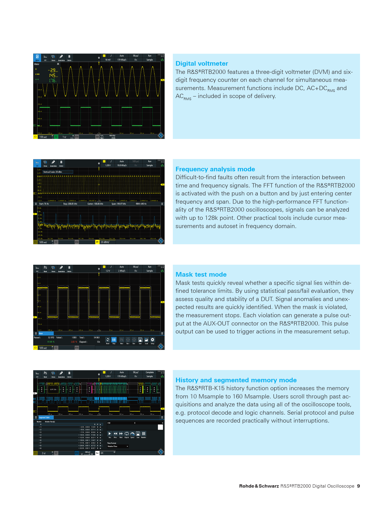 Digital voltmeter The R&S®RTB2000 features a three-digit voltmeter (DVM) and six- digit frequency counter on each channel for simultaneous mea- surements. Measurement functions include DC, AC+DC and RMS AC – included in scope of delivery. RMS Frequency analysis mode Difficult-to-find faults often result from the interaction between time and frequency signals. The FFT function of the R&S®RTB2000 is activated with the push on a button and by just entering center frequency and span. Due to the high-performance FFT function- ality of the R&S®RTB2000 oscilloscopes, signals can be analyzed with up to 128k point. Other practical tools include cursor mea- surements and autoset in frequency domain. Mask test mode Mask tests quickly reveal whether a specific signal lies within de- fined tolerance limits. By using statistical pass/fail evaluation, they assess quality and stability of a DUT. Signal anomalies and unex- pected results are quickly identified. When the mask is violated, the measurement stops. Each violation can generate a pulse out- put at the AUX-OUT connector on the R&S®RTB2000. This pulse output can be used to trigger actions in the measurement setup. History and segmented memory mode The R&S®RTB-K15 history function option increases the memory from 10 Msample to 160 Msample. Users scroll through past ac- quisitions and analyze the data using all of the oscilloscope tools, e.g. protocol decode and logic channels. Serial protocol and pulse sequences are recorded practically without interruptions. Rohde & Schwarz R&S®RTB2000 Digital Oscilloscope 9 RTB2000_bro_en_3607-4270-12_v0400.indd 9 07.06.2017 15:53:18