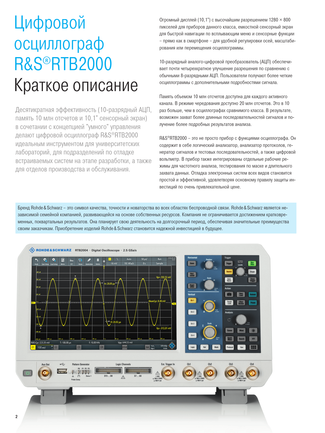 Цифровой Огромный дисплей (10,1") с высочайшим разрешением 1280 × 800 пикселей для приборов данного класса, емкостной сенсорный экран осциллограф для быстрой навигации по всплывающим меню и сенсорные функции – прямо как в смартфоне – для удобной регулировки осей, масштаби- рования или перемещения осциллограммы. R&S®RTB2000 10-разрядный аналого-цифровой преобразователь (АЦП) обеспечи- вает почти четырехкратное улучшение разрешения по сравнению с Краткое описание обычными 8-разрядными АЦП. Пользователи получают более четкие осциллограммы с дополнительными подробностями сигнала. Память объемом 10 млн отсчетов доступна для каждого активного канала. В режиме чередования доступно 20 млн отсчетов. Это в 10 Десятикратная эффективность (10-разрядный АЦП, раз больше, чем в осциллографах сравнимого класса. В результате, память 10 млн отсчетов и 10,1" сенсорный экран) возможен захват более длинных последовательностей сигналов и по- в сочетании с концепцией "умного" управления лучение более подробных результатов анализа. делают цифровой осциллограф R&S®RTB2000 R&S®RTB2000 – это не просто прибор с функциями осциллографа. Он идеальным инструментом для университетских содержит в себе логический анализатор, анализатор протоколов, ге- лабораторий, для подразделений по отладке нератор сигналов и тестовых последовательностей, а также цифровой встраиваемых систем на этапе разработки, а также вольтметр. В прибор также интегрированы отдельные рабочие ре- для отделов производства и обслуживания. жимы для частотного анализа, тестирования по маске и длительного захвата данных. Отладка электронных систем всех видов становится простой и эффективной, удовлетворяя основному правилу защиты ин- вестиций по очень привлекательной цене. Бренд Rohde & Schwarz – это символ качества, точности и новаторства во всех областях беспроводной связи. Rohde & Schwarz является не- зависимой семейной компанией, развивающейся на основе собственных ресурсов. Компания не ограничивается достижением кратковре- менных, поквартальных результатов. Она планирует свою деятельность на долгосрочный период, обеспечивая значительные преимущества своим заказчикам. Приобретение изделий Rohde & Schwarz становится надежной инвестицией в будущее. 2 RTB2000_bro_ru_3607-4270-18_v0301.indd 2 04.04.2017 08:49:39