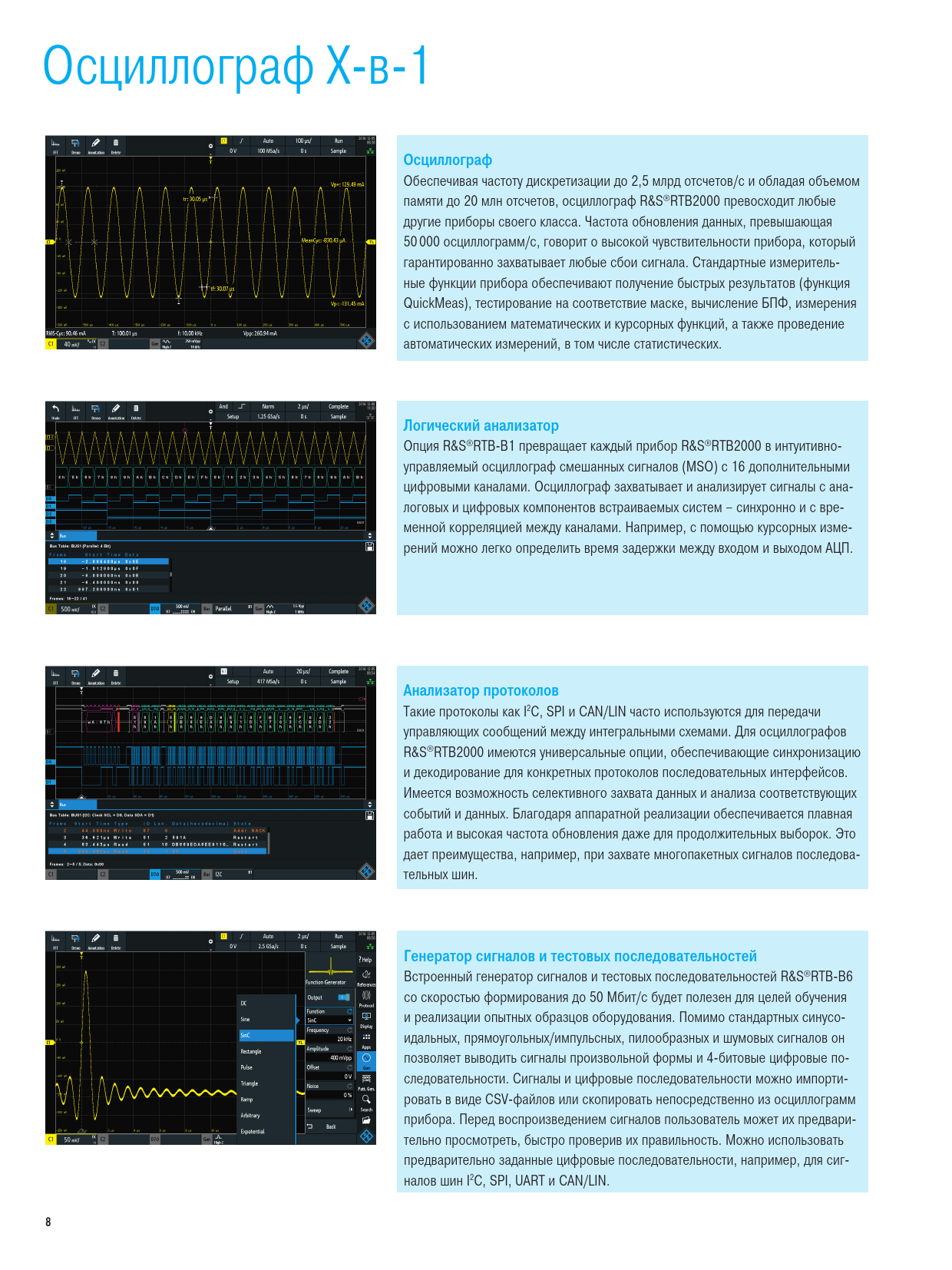 Осциллограф X-в-1 Осциллограф Обеспечивая частоту дискретизации до 2,5 млрд отсчетов/с и обладая объемом памяти до 20 млн отсчетов, осциллограф R&S®RTB2000 превосходит любые другие приборы своего класса. Частота обновления данных, превышающая 50 000 осциллограмм/с, говорит о высокой чувствительности прибора, который гарантированно захватывает любые сбои сигнала. Стандартные измеритель- ные функции прибора обеспечивают получение быстрых результатов (функция QuickMeas), тестирование на соответствие маске, вычисление БПФ, измерения с использованием математических и курсорных функций, а также проведение автоматических измерений, в том числе статистических. Логический анализатор Опция R&S®RTB-B1 превращает каждый прибор R&S®RTB2000 в интуитивно- управляемый осциллограф смешанных сигналов (MSO) с 16 дополнительными цифровыми каналами. Осциллограф захватывает и анализирует сигналы с ана- логовых и цифровых компонентов встраиваемых систем – синхронно и с вре- менной корреляцией между каналами. Например, с помощью курсорных изме- рений можно легко определить время задержки между входом и выходом АЦП. Анализатор протоколов Такие протоколы как I2C, SPI и CAN/LIN часто используются для передачи управляющих сообщений между интегральными схемами. Для осциллографов R&S®RTB2000 имеются универсальные опции, обеспечивающие синхронизацию и декодирование для конкретных протоколов последовательных интерфейсов. Имеется возможность селективного захвата данных и анализа соответствующих событий и данных. Благодаря аппаратной реализации обеспечивается плавная работа и высокая частота обновления даже для продолжительных выборок. Это дает преимущества, например, при захвате многопакетных сигналов последова- тельных шин. Генератор сигналов и тестовых последовательностей Встроенный генератор сигналов и тестовых последовательностей R&S®RTB-B6 со скоростью формирования до 50 Мбит/с будет полезен для целей обучения и реализации опытных образцов оборудования. Помимо стандартных синусо- идальных, прямоугольных/импульсных, пилообразных и шумовых сигналов он позволяет выводить сигналы произвольной формы и 4-битовые цифровые по- следовательности. Сигналы и цифровые последовательности можно импорти- ровать в виде CSV-файлов или скопировать непосредственно из осциллограмм прибора. Перед воспроизведением сигналов пользователь может их предвари- тельно просмотреть, быстро проверив их правильность. Можно использовать предварительно заданные цифровые последовательности, например, для сиг- налов шин I2C, SPI, UART и CAN/LIN. 8 RTB2000_bro_ru_3607-4270-18_v0301.indd 8 04.04.2017 08:49:49