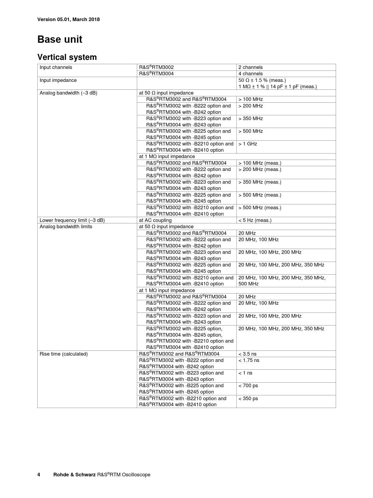 Version 05.01, March 2018Base unitVertical system Input channels R&S®RTM3002 2 channels R&S®RTM3004 4 channels Input impedance 50 Ω ± 1.5 % (meas.) 1 MΩ ± 1 % || 14 pF ± 1 pF (meas.) Analog bandwidth (–3 dB) at 50 Ω input impedance R&S®RTM3002 and R&S®RTM3004 > 100 MHz R&S®RTM3002 with -B222 option and > 200 MHz R&S®RTM3004 with -B242 option R&S®RTM3002 with -B223 option and > 350 MHz R&S®RTM3004 with -B243 option R&S®RTM3002 with -B225 option and > 500 MHz R&S®RTM3004 with -B245 option R&S®RTM3002 with -B2210 option and > 1 GHz R&S®RTM3004 with -B2410 option at 1 MΩ input impedance R&S®RTM3002 and R&S®RTM3004 > 100 MHz (meas.) R&S®RTM3002 with -B222 option and > 200 MHz (meas.) R&S®RTM3004 with -B242 option R&S®RTM3002 with -B223 option and > 350 MHz (meas.) R&S®RTM3004 with -B243 option R&S®RTM3002 with -B225 option and > 500 MHz (meas.) R&S®RTM3004 with -B245 option R&S®RTM3002 with -B2210 option and > 500 MHz (meas.) R&S®RTM3004 with -B2410 option Lower frequency limit (–3 dB) at AC coupling < 5 Hz (meas.) Analog bandwidth limits at 50 Ω input impedance R&S®RTM3002 and R&S®RTM3004 20 MHz R&S®RTM3002 with -B222 option and 20 MHz, 100 MHz R&S®RTM3004 with -B242 option R&S®RTM3002 with -B223 option and 20 MHz, 100 MHz, 200 MHz R&S®RTM3004 with -B243 option R&S®RTM3002 with -B225 option and 20 MHz, 100 MHz, 200 MHz, 350 MHz R&S®RTM3004 with -B245 option R&S®RTM3002 with -B2210 option and 20 MHz, 100 MHz, 200 MHz, 350 MHz, R&S®RTM3004 with -B2410 option 500 MHz at 1 MΩ input impedance R&S®RTM3002 and R&S®RTM3004 20 MHz R&S®RTM3002 with -B222 option and 20 MHz, 100 MHz R&S®RTM3004 with -B242 option R&S®RTM3002 with -B223 option and 20 MHz, 100 MHz, 200 MHz R&S®RTM3004 with -B243 option R&S®RTM3002 with -B225 option, 20 MHz, 100 MHz, 200 MHz, 350 MHz R&S®RTM3004 with -B245 option, R&S®RTM3002 with -B2210 option and R&S®RTM3004 with -B2410 option Rise time (calculated) R&S®RTM3002 and R&S®RTM3004 < 3.5 ns R&S®RTM3002 with -B222 option and < 1.75 ns R&S®RTM3004 with -B242 option R&S®RTM3002 with -B223 option and < 1 ns R&S®RTM3004 with -B243 option R&S®RTM3002 with -B225 option and < 700 ps R&S®RTM3004 with -B245 option R&S®RTM3002 with -B2210 option and < 350 ps R&S®RTM3004 with -B2410 option 4Rohde & Schwarz R&S®RTM Oscilloscope