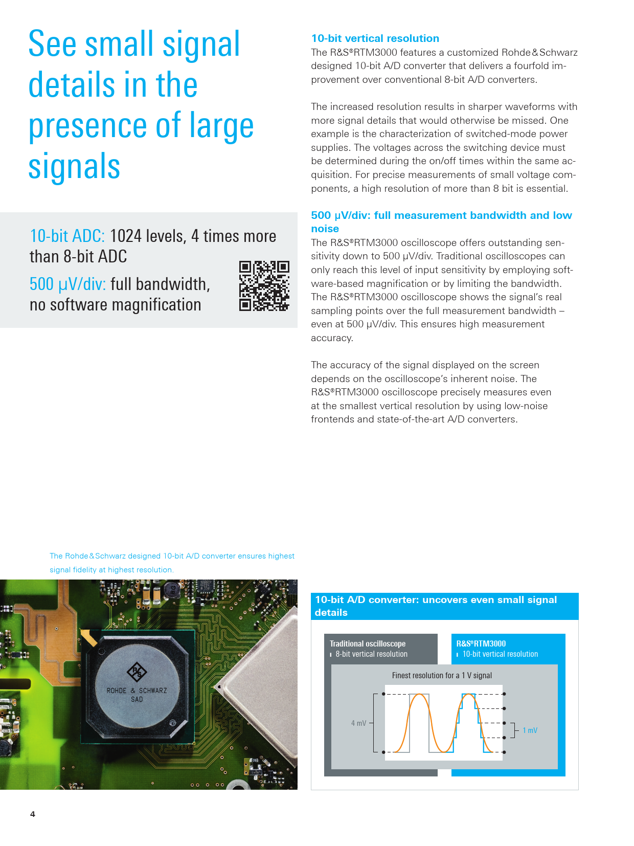 10-bit vertical resolution See small signal The R&S®RTM3000 features a customized Rohde & Schwarz designed 10-bit A/D converter that delivers a fourfold im- provement over conventional 8-bit A/D converters. details in the The increased resolution results in sharper waveforms with more signal details that would otherwise be missed. One presence of large example is the characterization of switched-mode power supplies. The voltages across the switching device must be determined during the on/off times within the same ac- signals quisition. For precise measurements of small voltage com- ponents, a high resolution of more than 8 bit is essential. 500 µV/div: full measurement bandwidth and low noise 10-bit ADC: 1024 levels, 4 times more The R&S®RTM3000 oscilloscope offers outstanding sen- sitivity down to 500 µV/div. Traditional oscilloscopes can than 8-bit ADC only reach this level of input sensitivity by employing soft- ware-based magnification or by limiting the bandwidth. 500 µV/div: full bandwidth, The R&S®RTM3000 oscilloscope shows the signal’s real no software magnification sampling points over the full measurement bandwidth – even at 500 µV/div. This ensures high measurement accuracy. The accuracy of the signal displayed on the screen depends on the oscilloscope’s inherent noise. The R&S®RTM3000 oscilloscope precisely measures even at the smallest vertical resolution by using low-noise frontends and state-of-the-art A/D converters. The Rohde & Schwarz designed 10-bit A/D converter ensures highest signal fidelity at highest resolution. 10-bit A/D converter: uncovers even small signal detailsTraditional oscilloscope¸RTM3000 ❙ 8-bit vertical resolution ❙ 10-bit vertical resolution Finest resolution for a 1 V signal 4 mV 1 mV 4 RTM3000_bro_en_5214-9144-12_v0402.indd 4 01.03.2018 08:46:01
